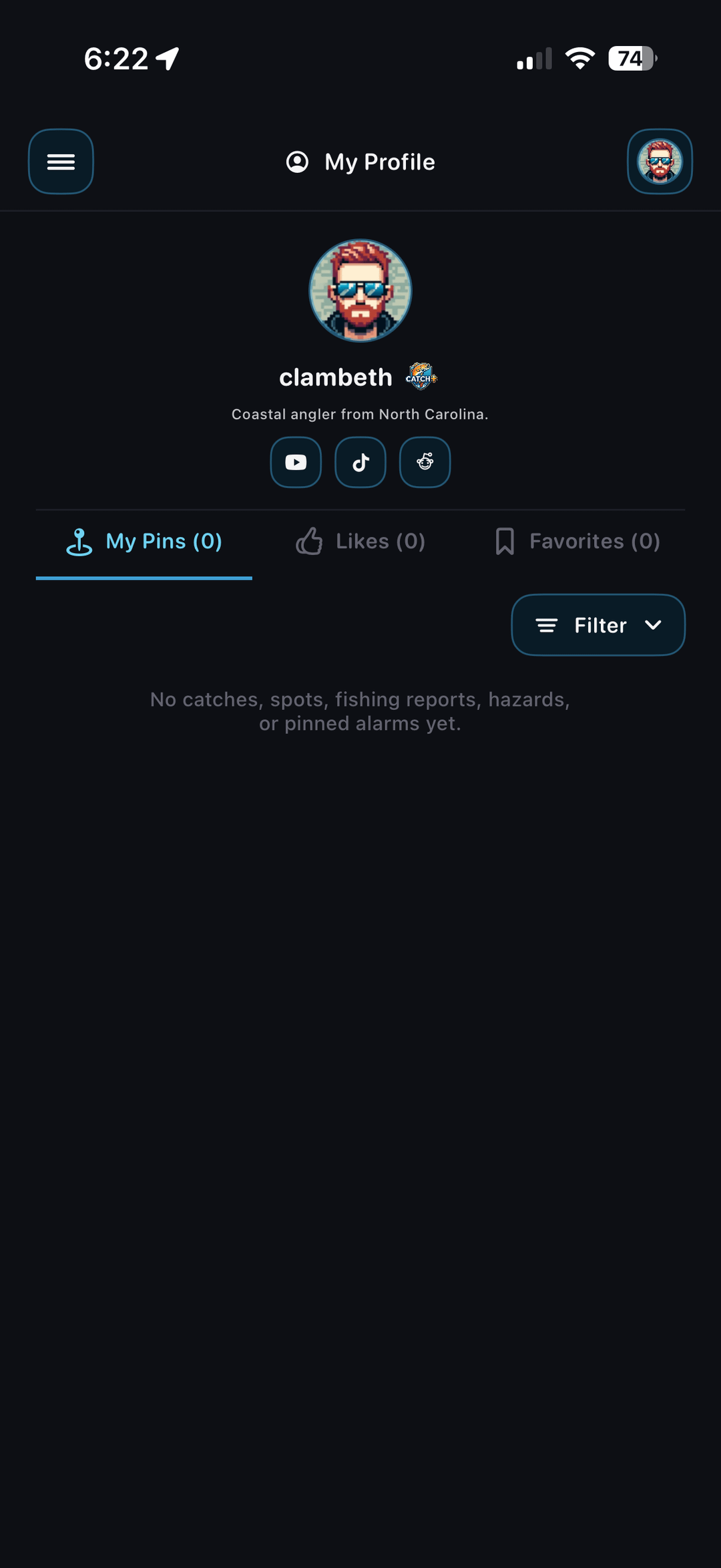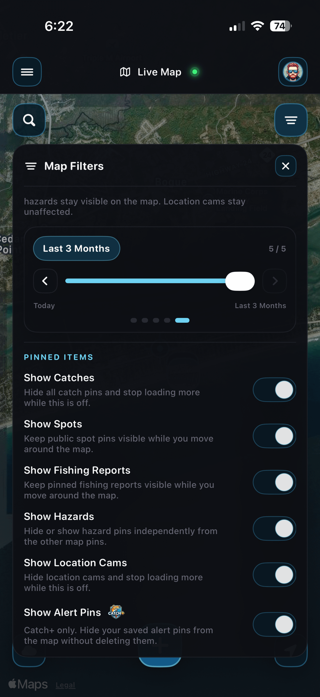 - Live Map with pinned catches, spots, fishing reports, hazards, and live cams (Public / Private pins)