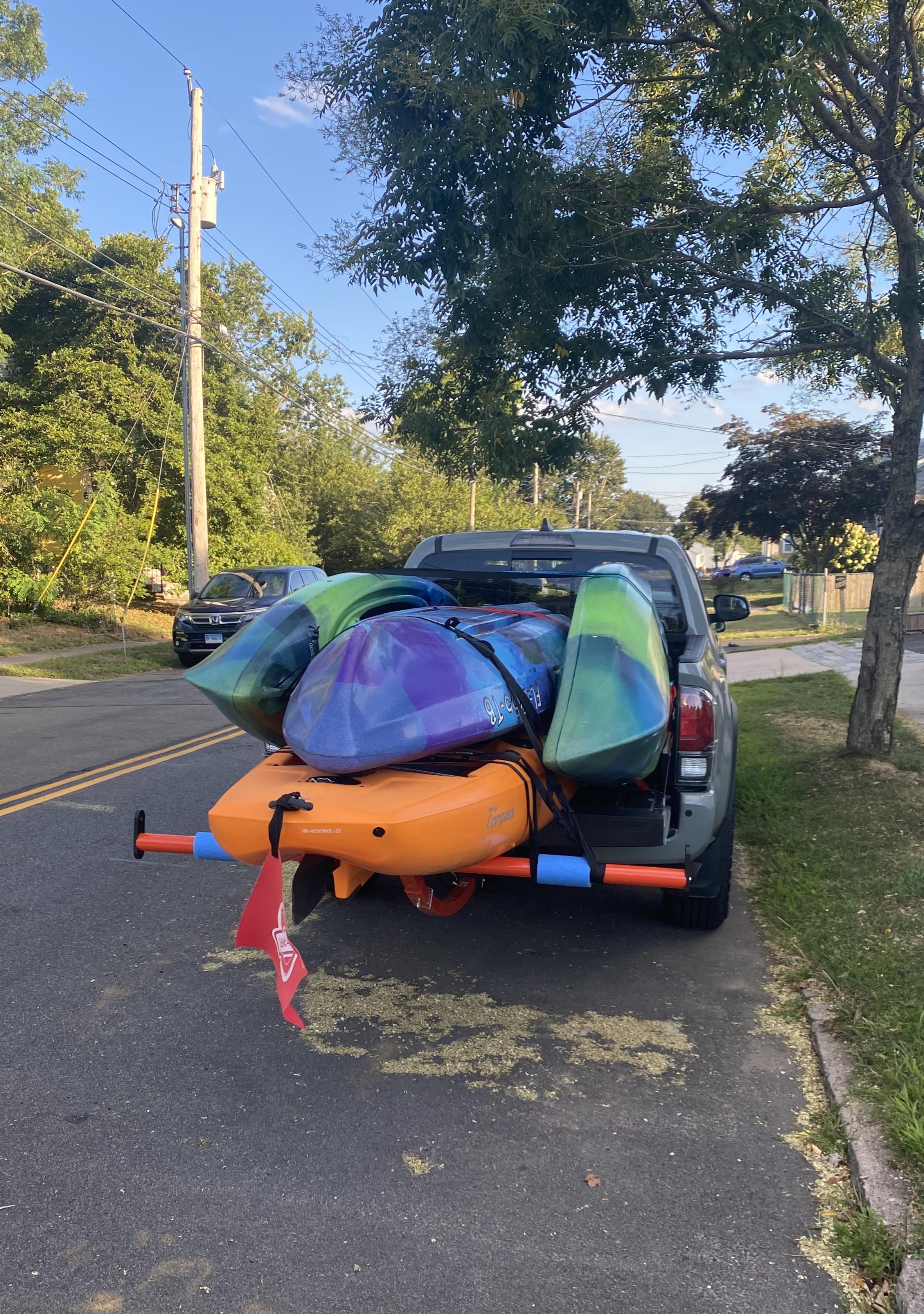 I was worried I made a mistake of not going for a longer bed but I’ve never run into problems making a bed extender work. Always feel secure and have driven a couple thousand miles with various amounts of kayaks, never more than pictured.
