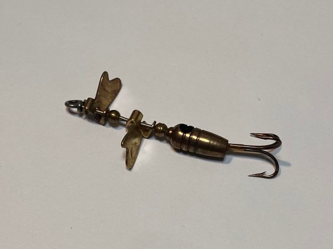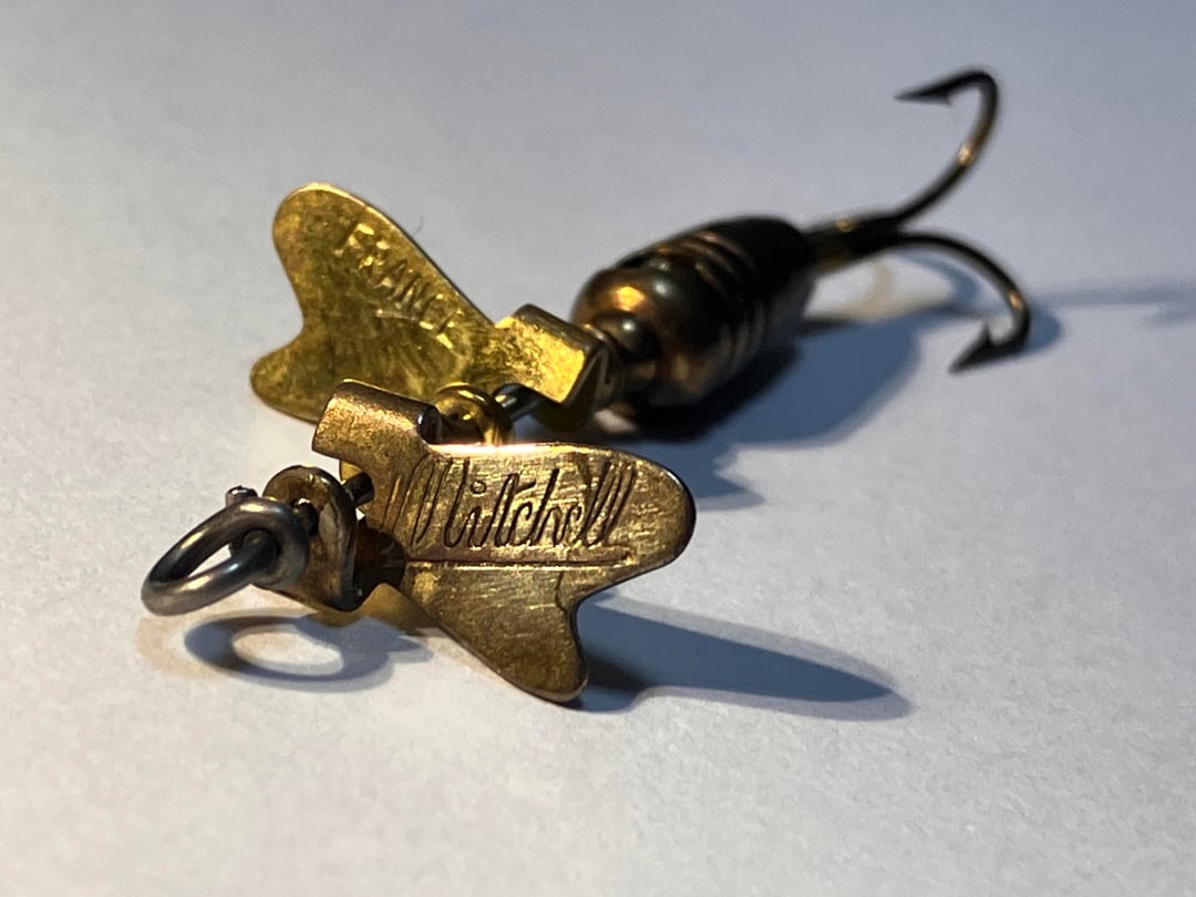 It is a spinner with two small blades, the same type used on the Hookwell. At first, I thought it was a defective Hookwell spinner. However, upon closer inspection, I noticed that the upper blade of the two-tiered blade setup is stamped with “Mitchell” (the small blade on regular Hookwell spinners is usually stamped “France”).
