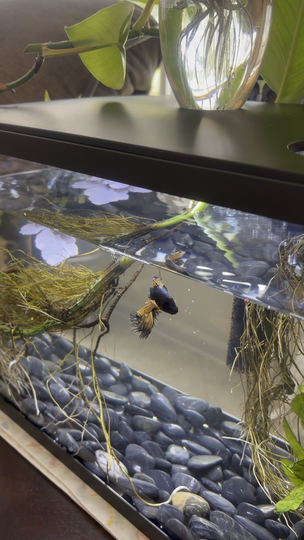 My god that’s some very unfortunate finnage. Poor guy can barely move. That said, please give him a lot more plants and other clutter to rest on! 🙁