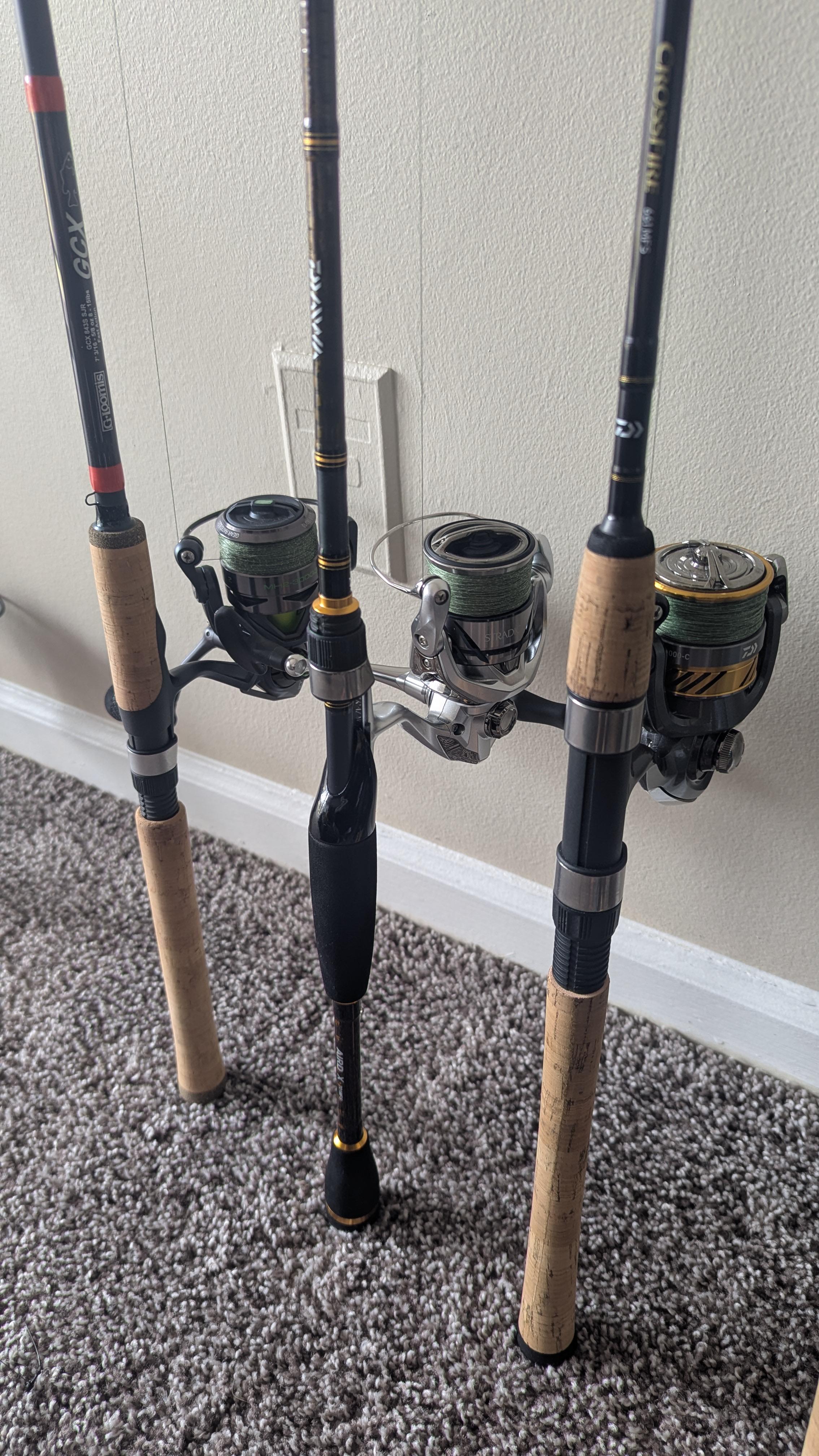 My 2nd year lineup! Left to right is my, ChatterBait/spinnerbaits/Texas rig combo (MH GCX/Mach 2), middle combo is my treble lure combo (M AridX/Stradic) and right is my panfishing combo with a hook split shot rig (M Crossfire/Laguna)