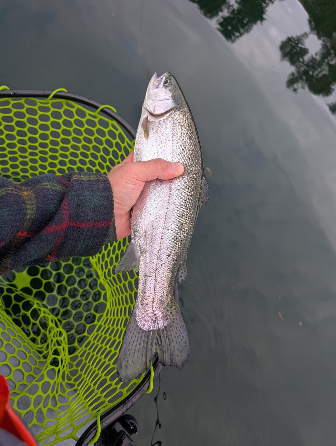 Today was the first real fishing trip, I was trying for Kokanee. The Kokanee didn't seem to be biting but I landed a number of nice rainbow trout. The boat tracked well with the downrigger deployed, which I was actually surprised about given the flat bottom and small skegs (weather was exceptionally calm though, so we shall see in the future if I need to figure out a bigger "keel" solution). El-Cheapo Drive worked great, some annoying creaking but it's not from the drive but from the drive cradle, which I hopefully can sort out. A number of niggling issues and ergonomics to deal with, that happens when you buy cheap, but I think I can come up with solutions.
