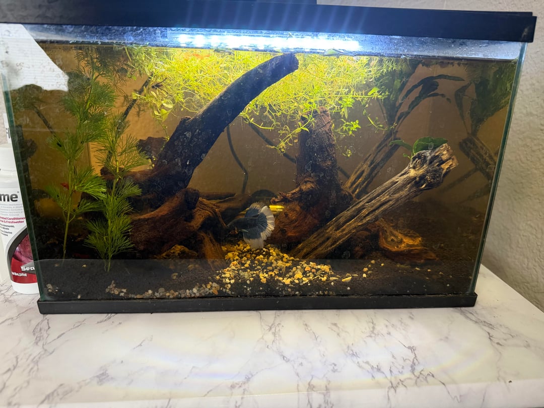 Hey guys this is my first betta, looking for tips. The tank size is 5.8g I’m looking to get more live plants but not sure what as honestly I’m not very into them! And help would be appreciated