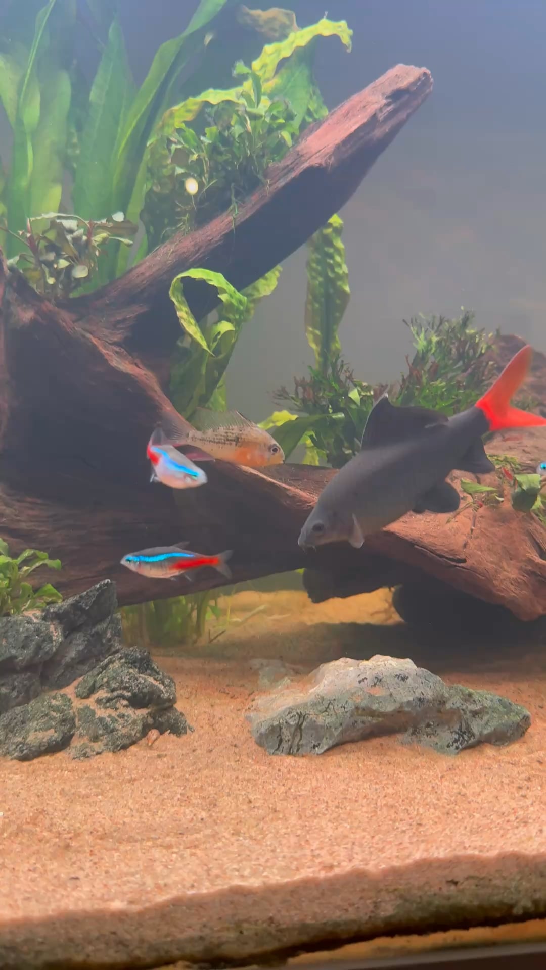 The ram has become playful and gotten a very red belly, indicating breeding behavior. But she left her partner (bigger male ram) and has apparently moved into the RTS’ cave. The RTS usually chase others out of the cave, but is very tolerant to this Ram 😅