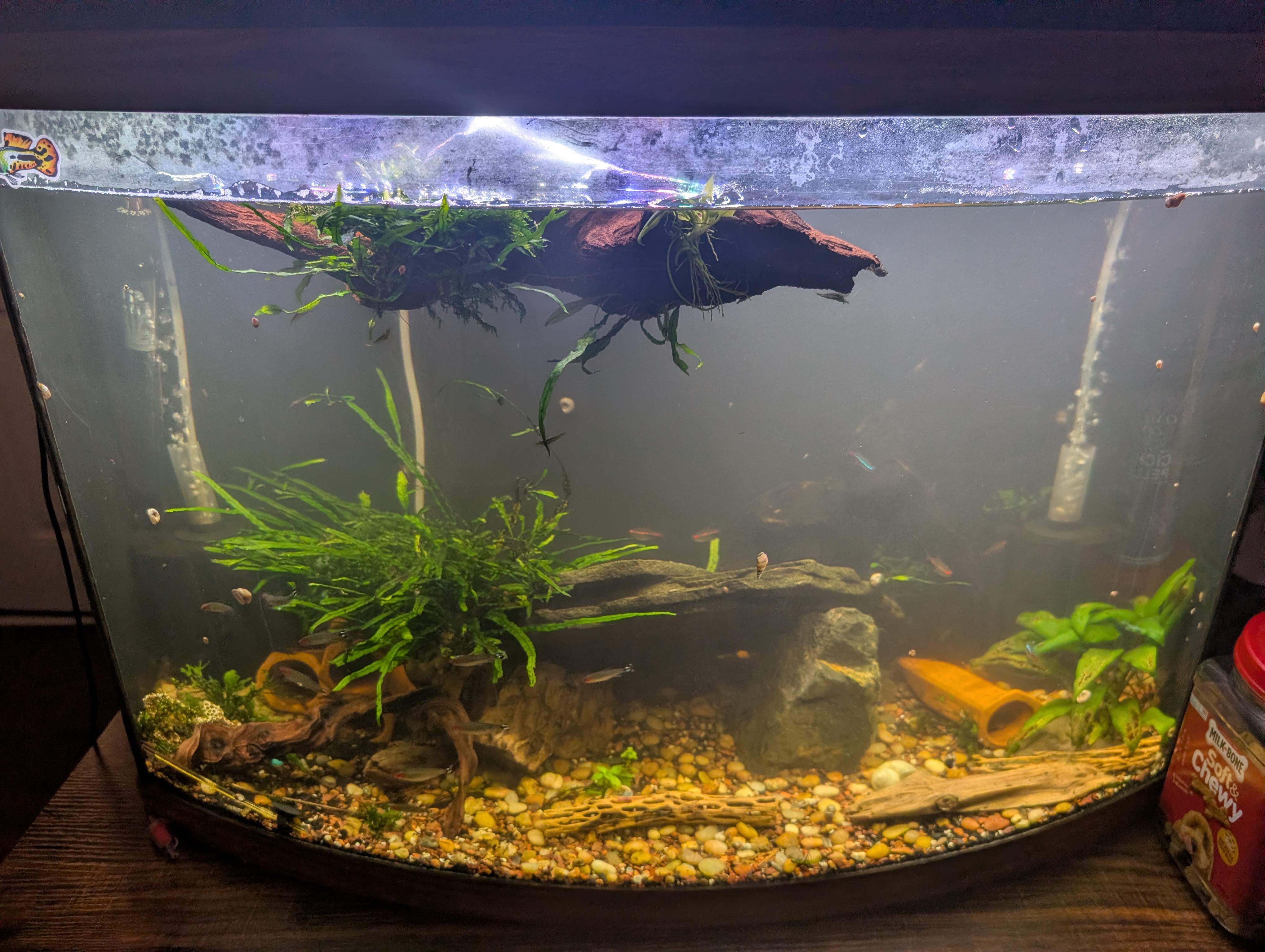 added a piece of driftwood to my tank, I did the normal procedure that I do with Driftwood, gave it a nice long boil to get some of the tannins out and to to help waterlog it, I glued on a couple plants and set it in the tank but it never sank when I put it in my tank. it has become sort of a floating island, the shrimp love it, they can swim up there to snag food off the surface without having to compete with the slower snails.