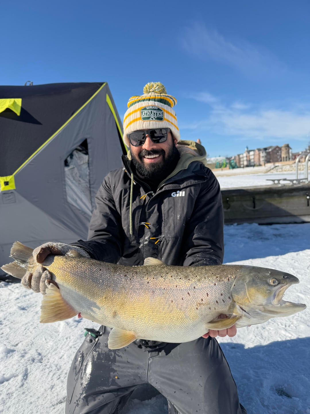 We have some world record brown trouts swimming in 5-8 foot of water southern Wisconsin harbors . They come to harbors late fall and stay till end of winter to spawn.