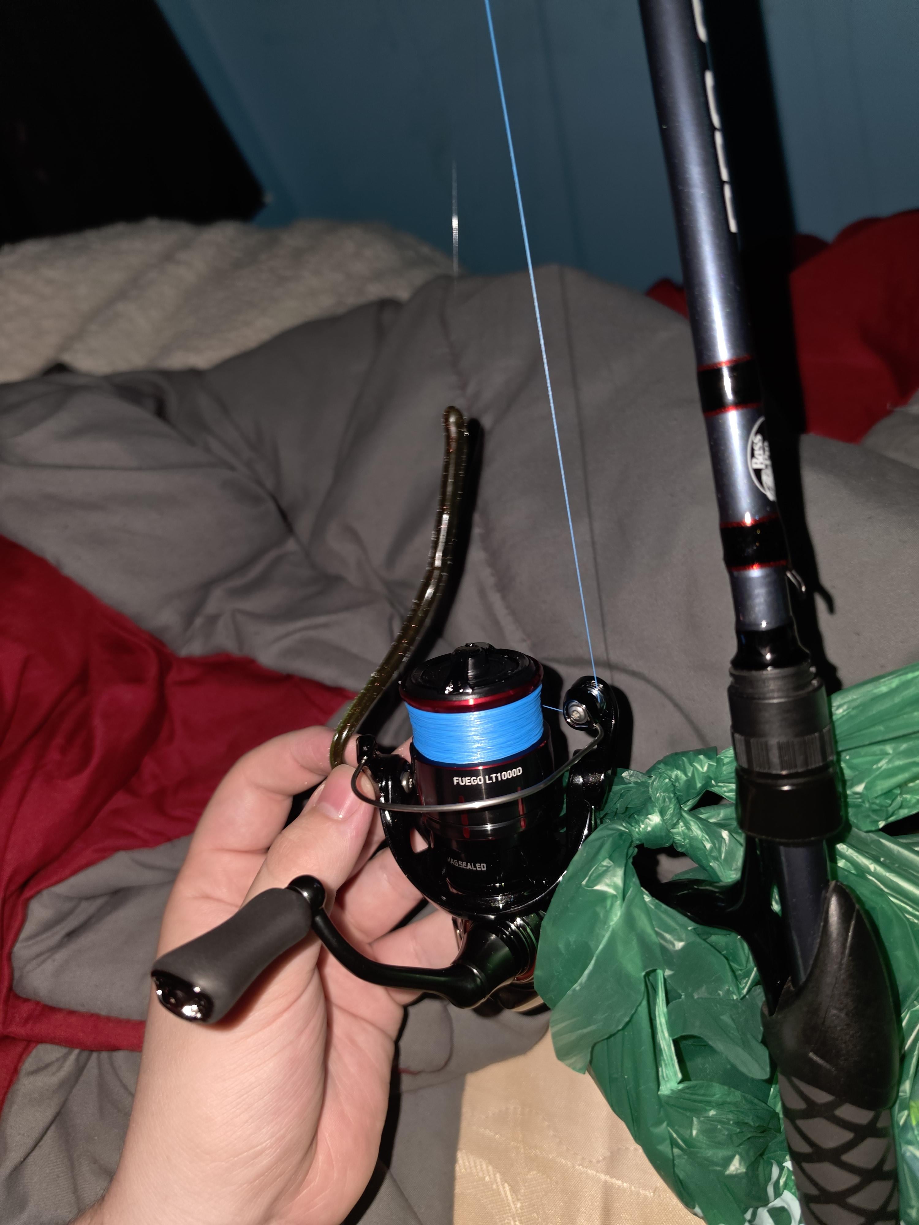We're all set! 1000 size spooled with some 4lb mono backing, some pretty blue 10lb panderra braid and some 4lb berkely fluoro leader with a 4.25in roboworm (and we're on left-hand retrieve now 🙂 Posted by ArkGodC-