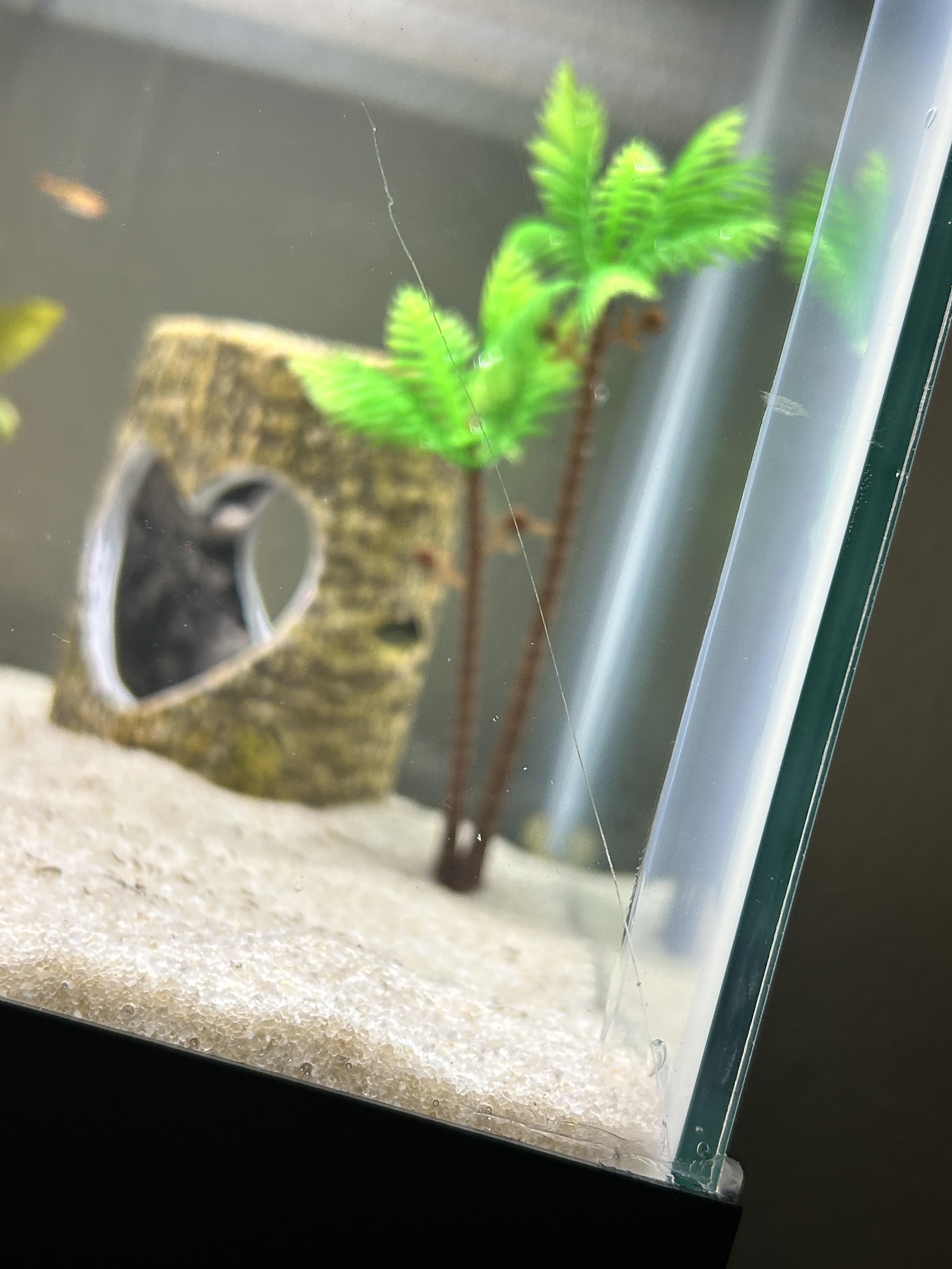 I just bought this aquarium yesterday and filled it up, 20 gallons. I examined it really well before getting it to make sure there were no cracks. After filling it up, this appeared, I definitely did not see it there yesterday. It’s pretty big. Is this a crack or is there a way the silicone can be visible only after filling the water up? I can only feel it from the outside, and the aquarium stand is leveled.