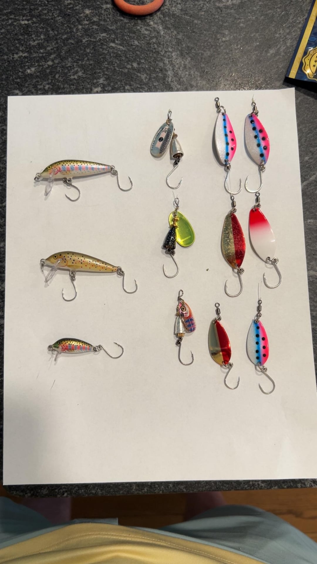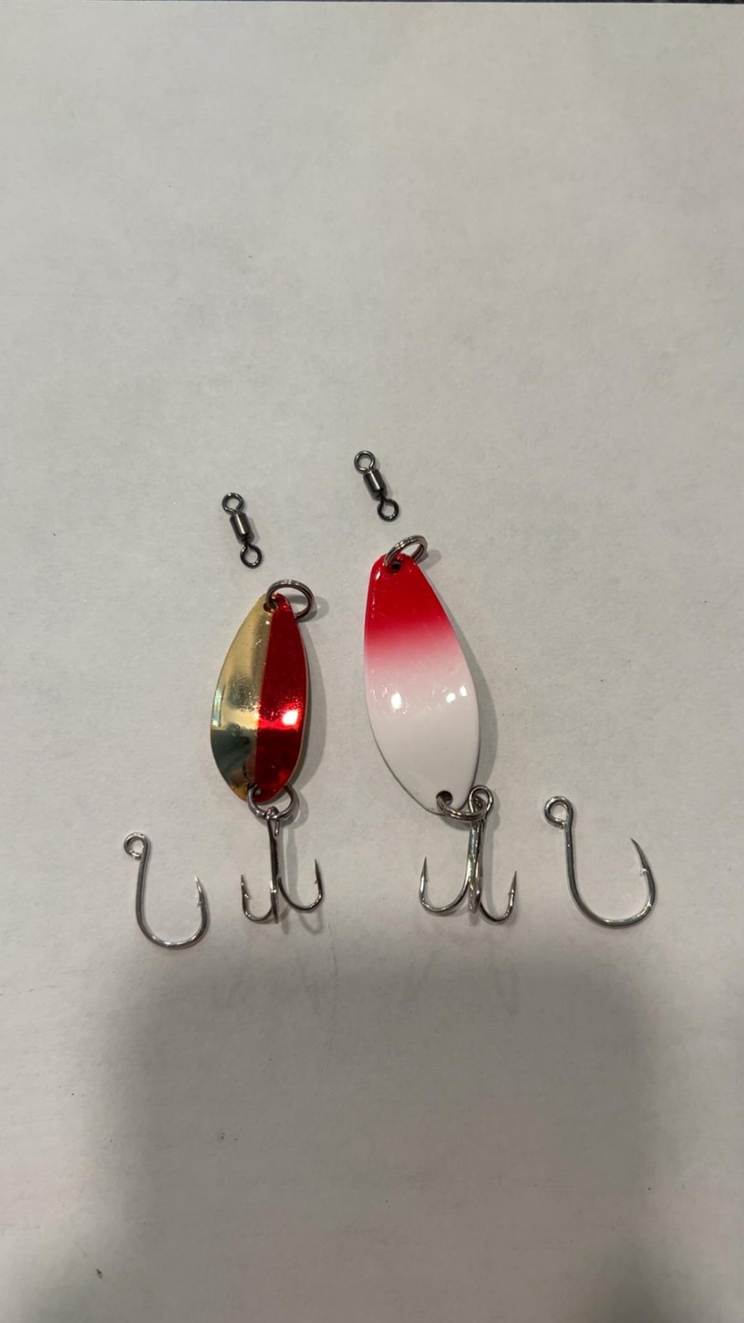 Here they are! A lot of you guys asked so I figured I’d just make a post. In-line spinners use size 6 (need a split ring to attach). Little Cleo’s use size 4/8 depending on weight and target species, and the rapala lures use size 8.