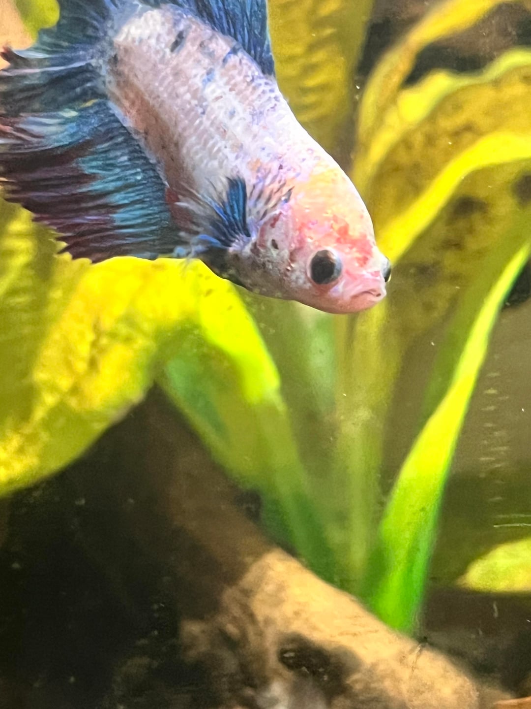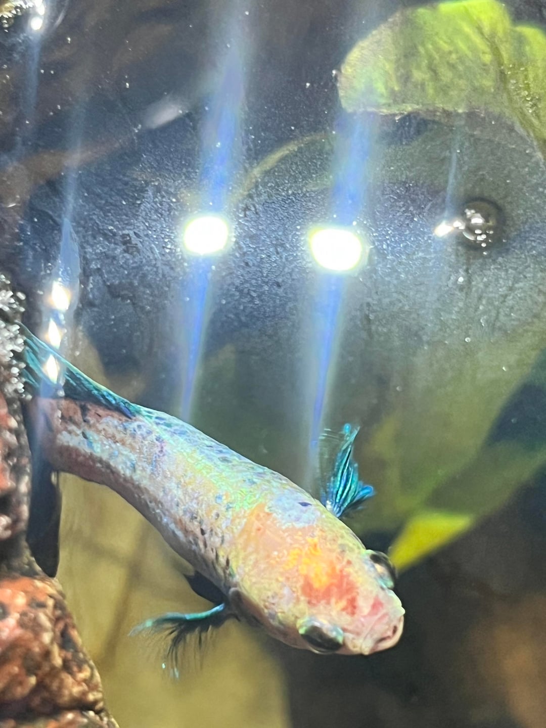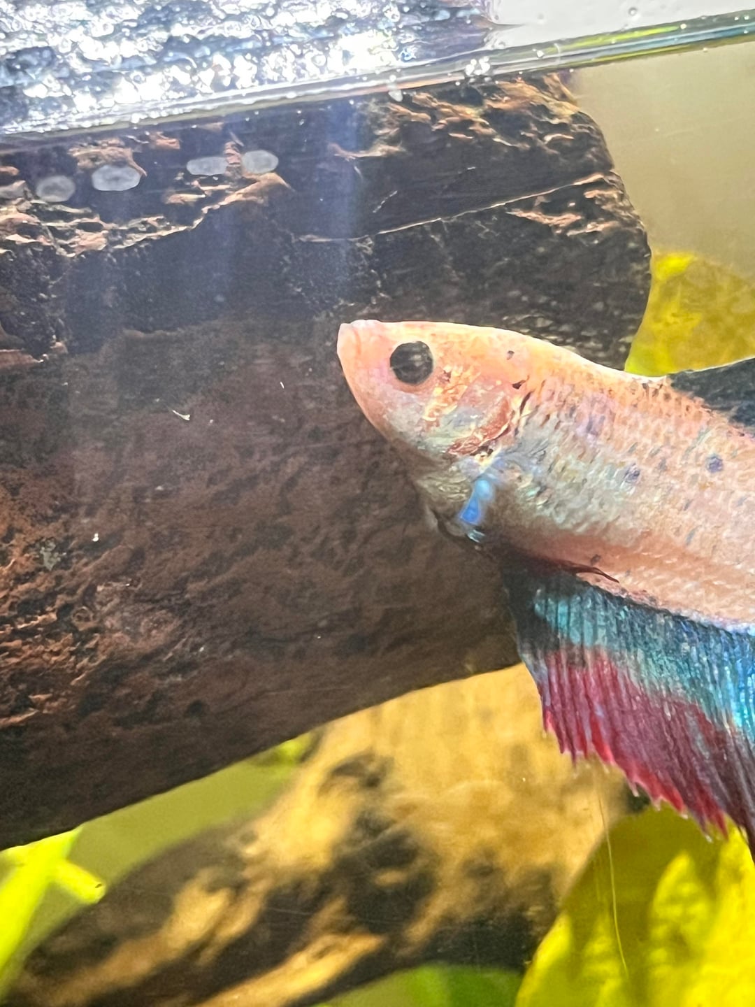 5 gallon tank w heater and filter. parameters with a liquid test kit are all normal – no ammonia, nitrates or nitrites. 10% water changes weekly. i feed her bug bites. all plants are silk or real, nothing sharp! she has a nerite snail buddy