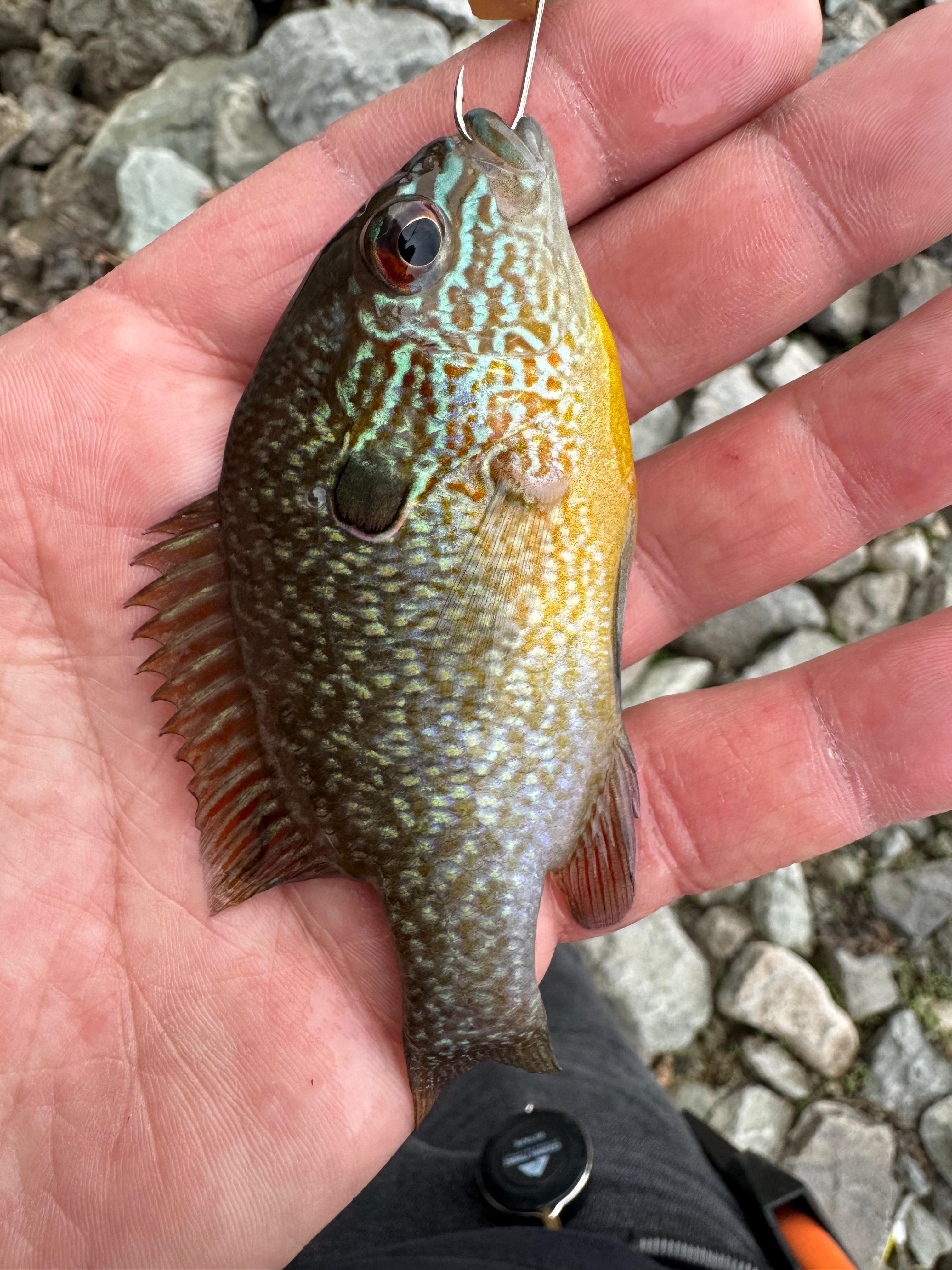 My buddy caught this in the white river near Indianapolis. I thought it was a pumpkinseed but it doesn’t have the red mark on the ear tab.