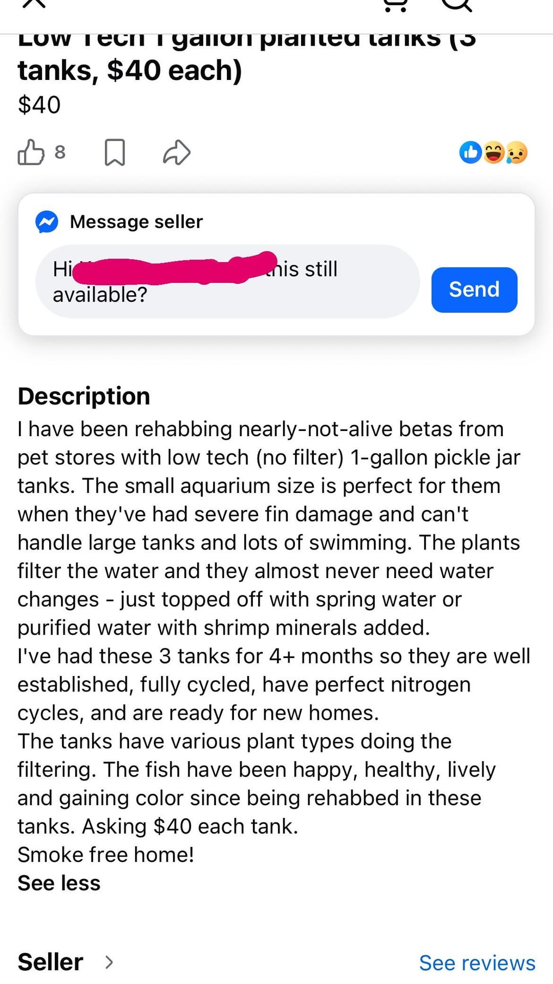 I mean maybe it’s fine as a hospital tank but… it still …is so tiny. For hospitals I try for 3 gallon. And they’re selling them as full set up tanks. I’m sorry but you just KNOW most people who buy these from this person and hear “never need water changes because plants” .. they’re just gonna keep that poor fish in there indefinitely. I’m sure of that.