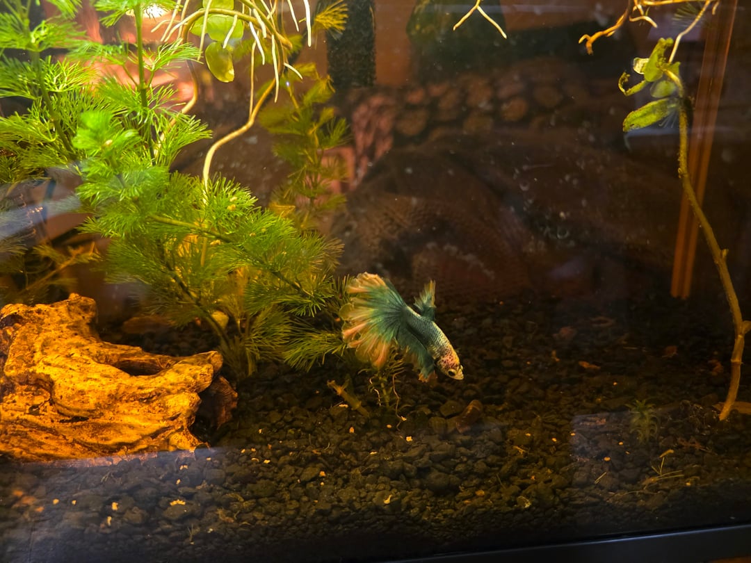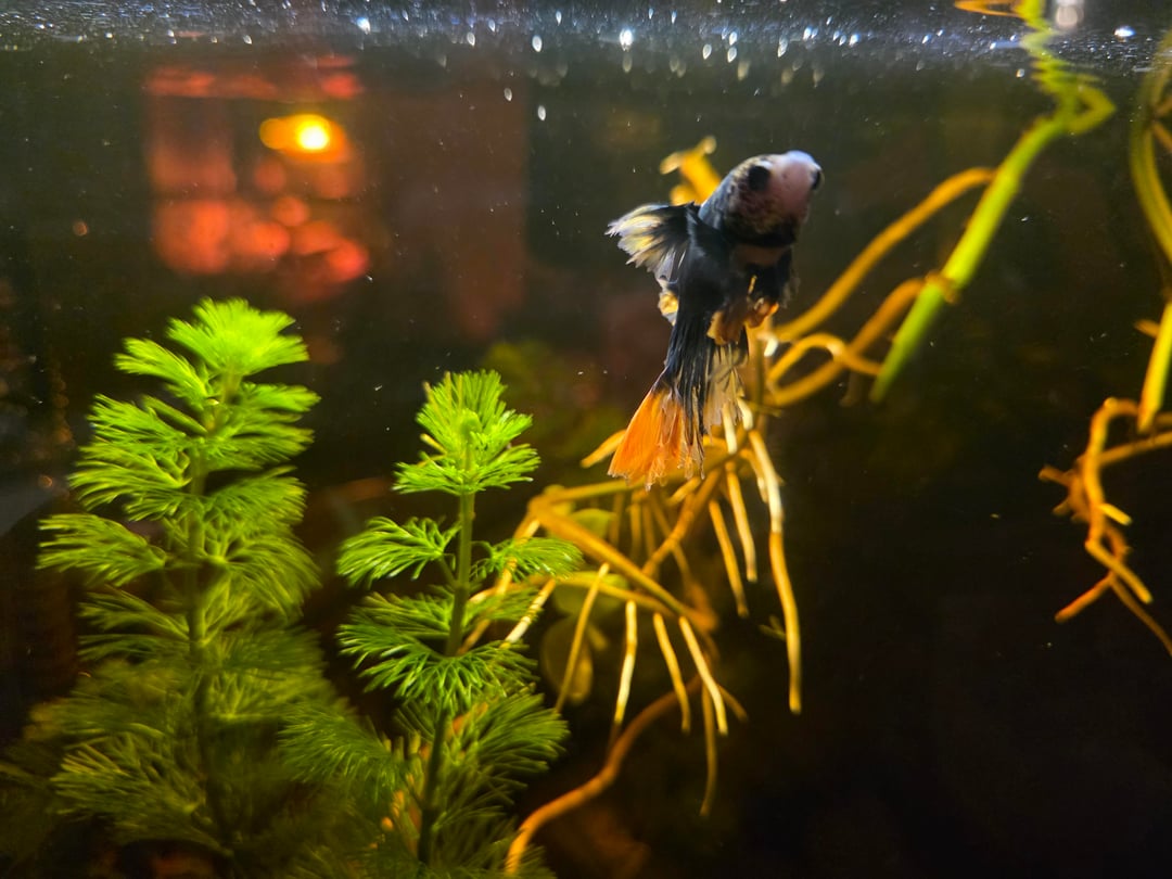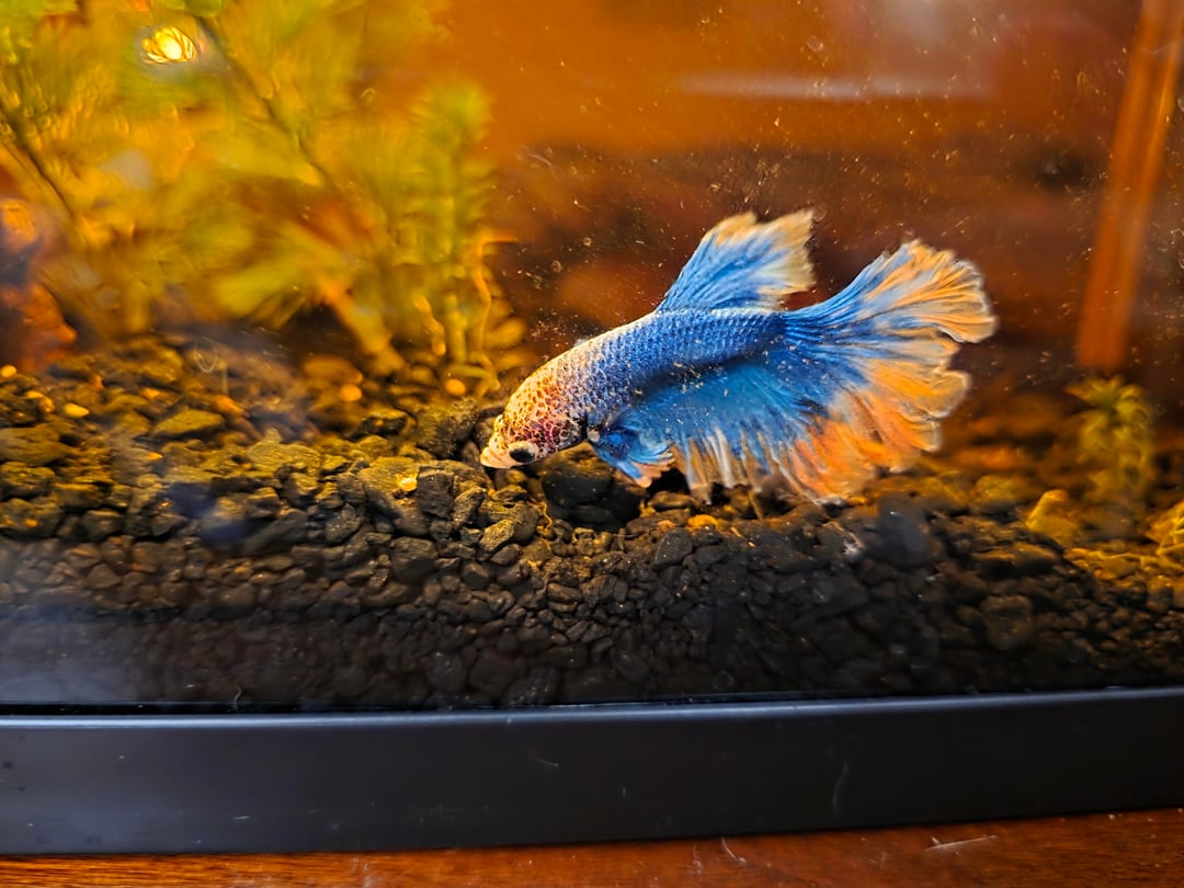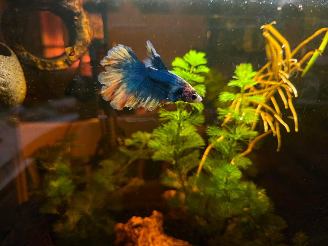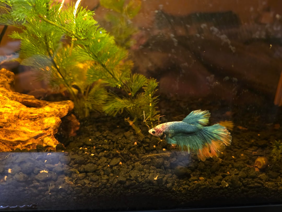 Now, he has a 10 gallon tank hiding spots, filter, heater, more live plants that get scoured for snails before planting. He does have 1 larger snail friend who helps maintain his tank, that he tolerates. His fins have come back and he is an avid swimmer.
