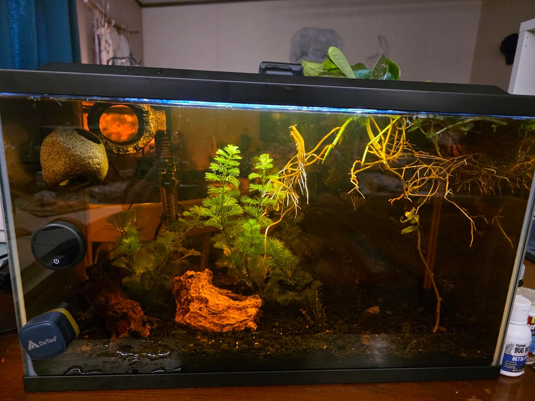 I did add a variety of pothos that will grow out of the top to help with the nitrogen exchange, though 1 betta and 1 snail in a 10 gallon will hardly wreck the water before a water change, lol.