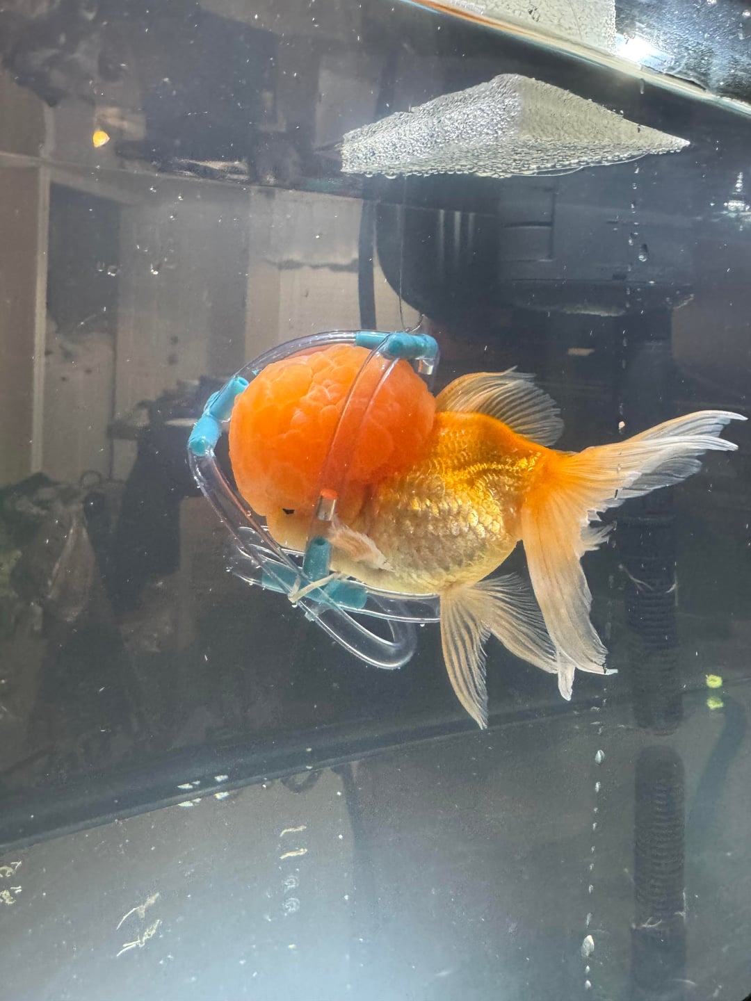 Just wanted to share my life jacket I made for a Rescued Oranda over the past weekend. Supposedly the vet punctured the swim bladder and poor guy was sitting sideways. None of the conventional life jackets on Google worked due to his massive brain (when) but I’m just proud of my 2 hours of engineering I tried for this guy.