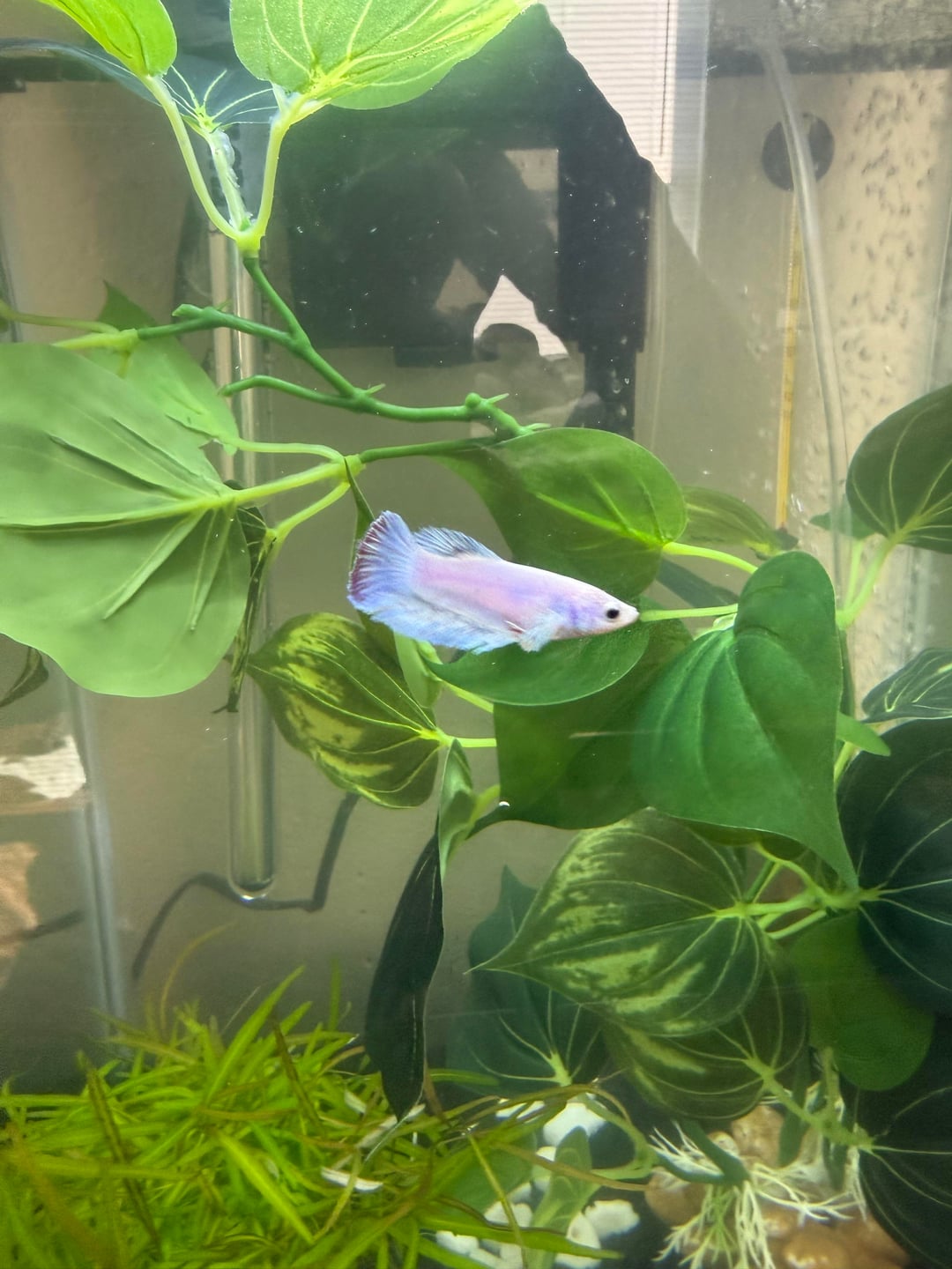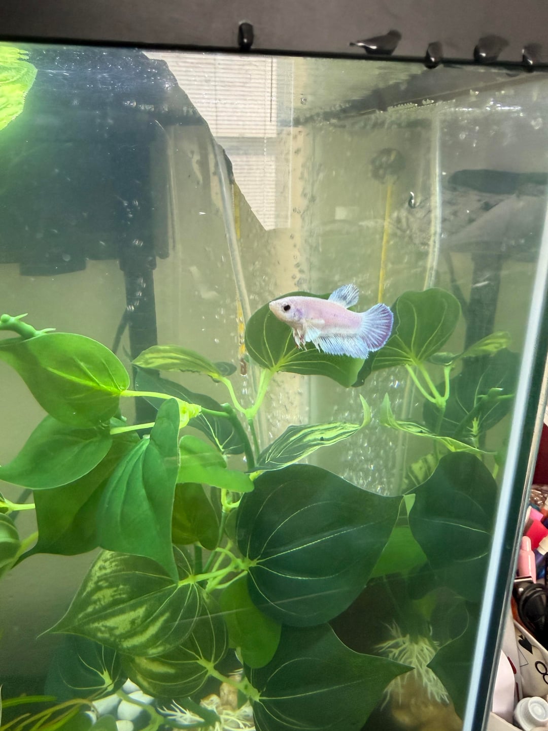 I recently got this half moon female for free as she has severe fin rot and was on the brink of death. I have no idea what color she is as she was pure white when I got her. (Also don’t mind the tank my 20g planted is cycling this is a temp 10g with silk and live plants)