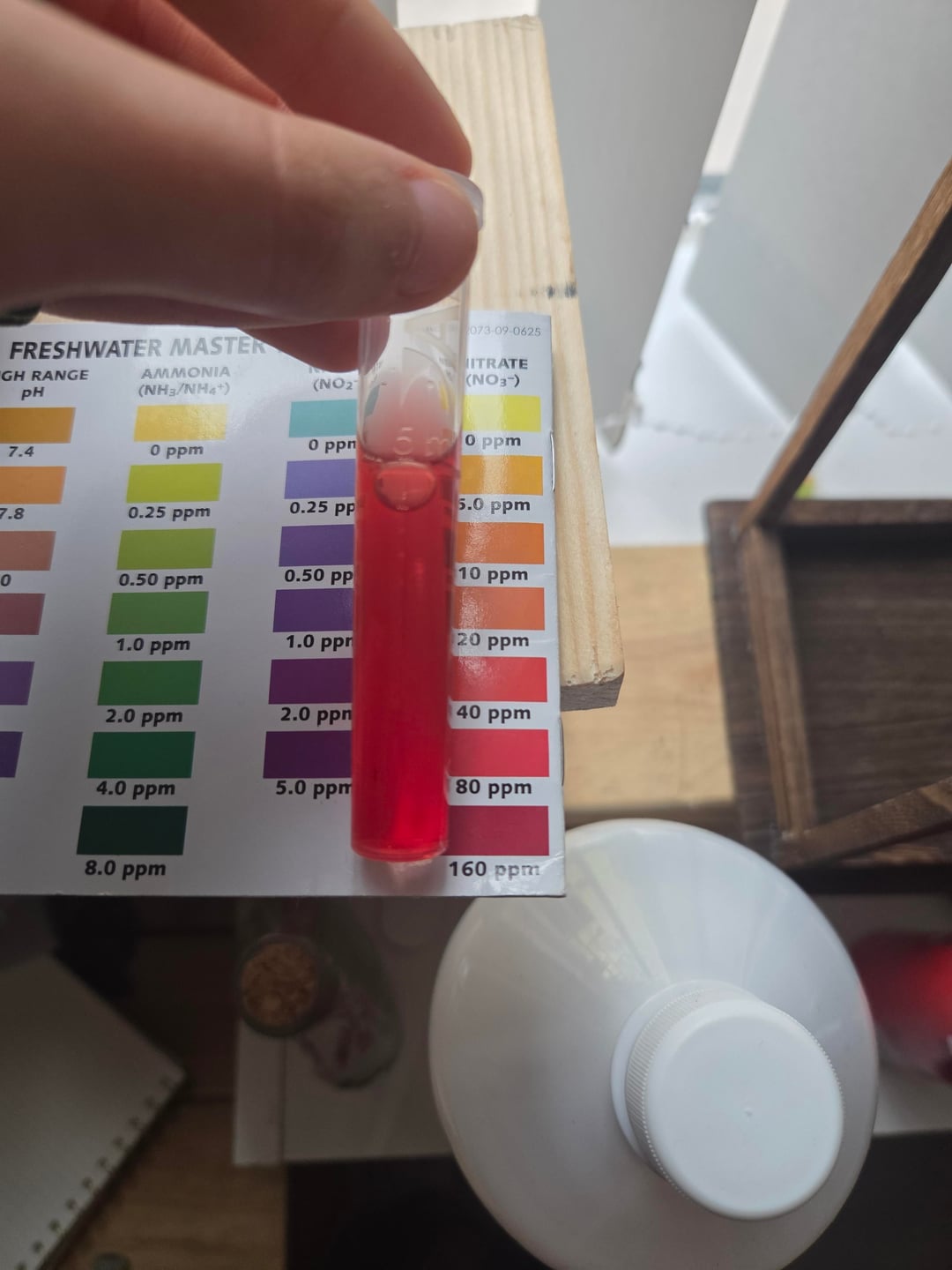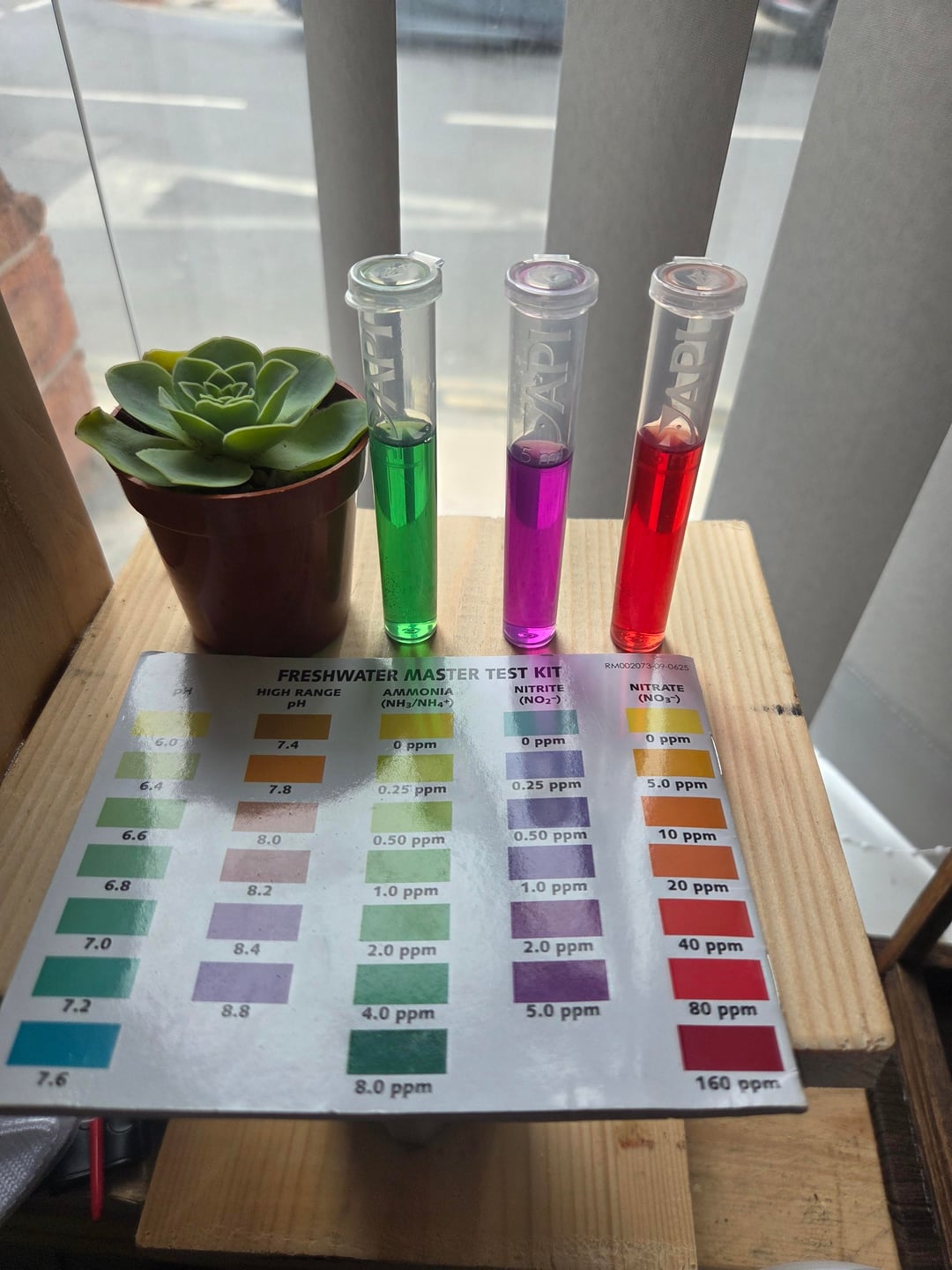 to read the amounts for water parameters exactly but I went from having a few Nitrites to between 2ppm-5ppm I think and Nitrates are at about 80ppm already though I thought people tend to get stuck with high nitrites for a while before any Nitrates appear at all? (pics attached for reference of readings from API water kit)
