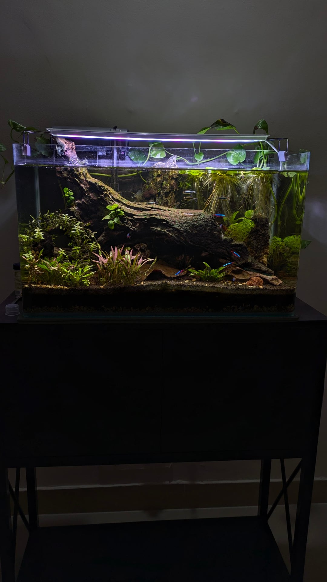 It's a 60x30x35 cm planted tank, ADA Amazonia aquasoil, lot of stem plants, dragon rocks, few small lava rocks, large driftwood at the centre, indian almond leaves litter, Pothos coming out, amazon frogbit floating
