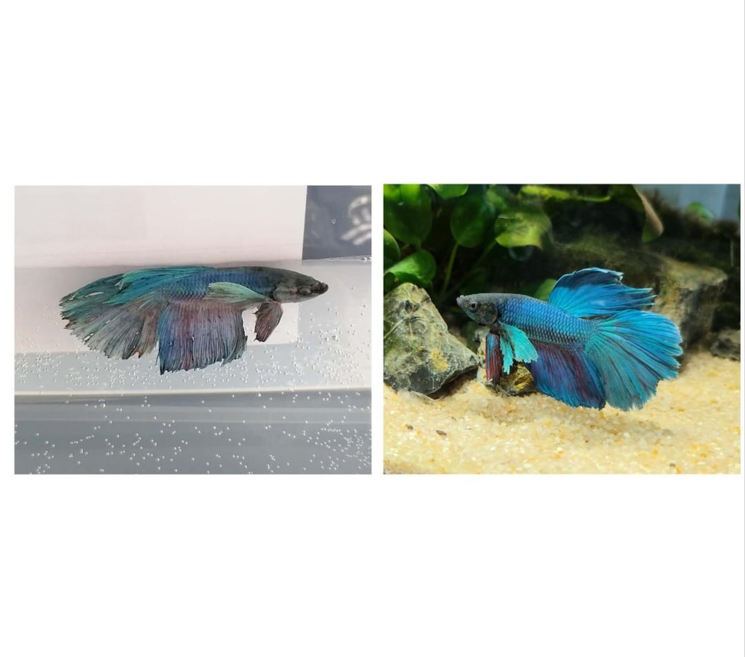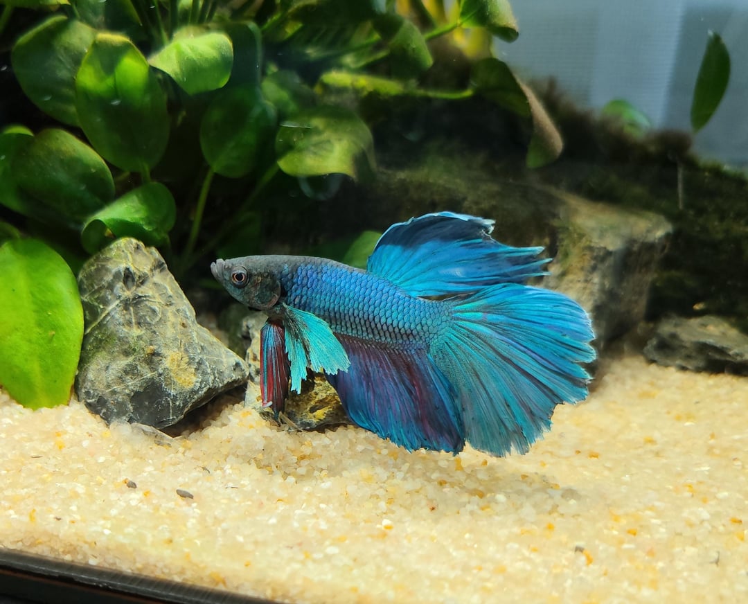This is Rio. I got him from a pet store for a heavy discount, and his state was awful. He had swim bladder issues (stayed at the surface on his side all the time), fin rot, popeye in his left eye, and was barely breathing. A couple of days of intensive care later, he made a full recovery! His fins still need some regrowing, but he is so much better! He loves to explore his tank, and flare at his shrimp buddies 😀