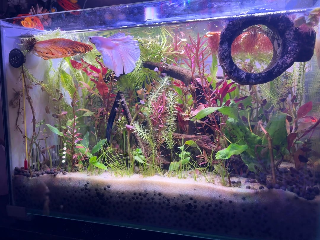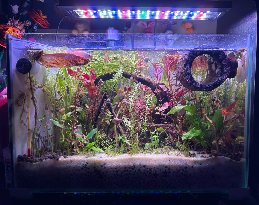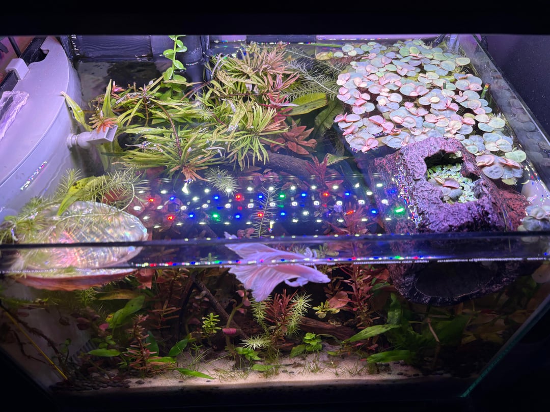 i’ve had my betta for a little over a month now, this tank has been so full of life! some of my red root floaters have flowers and he’s such an active happy betta