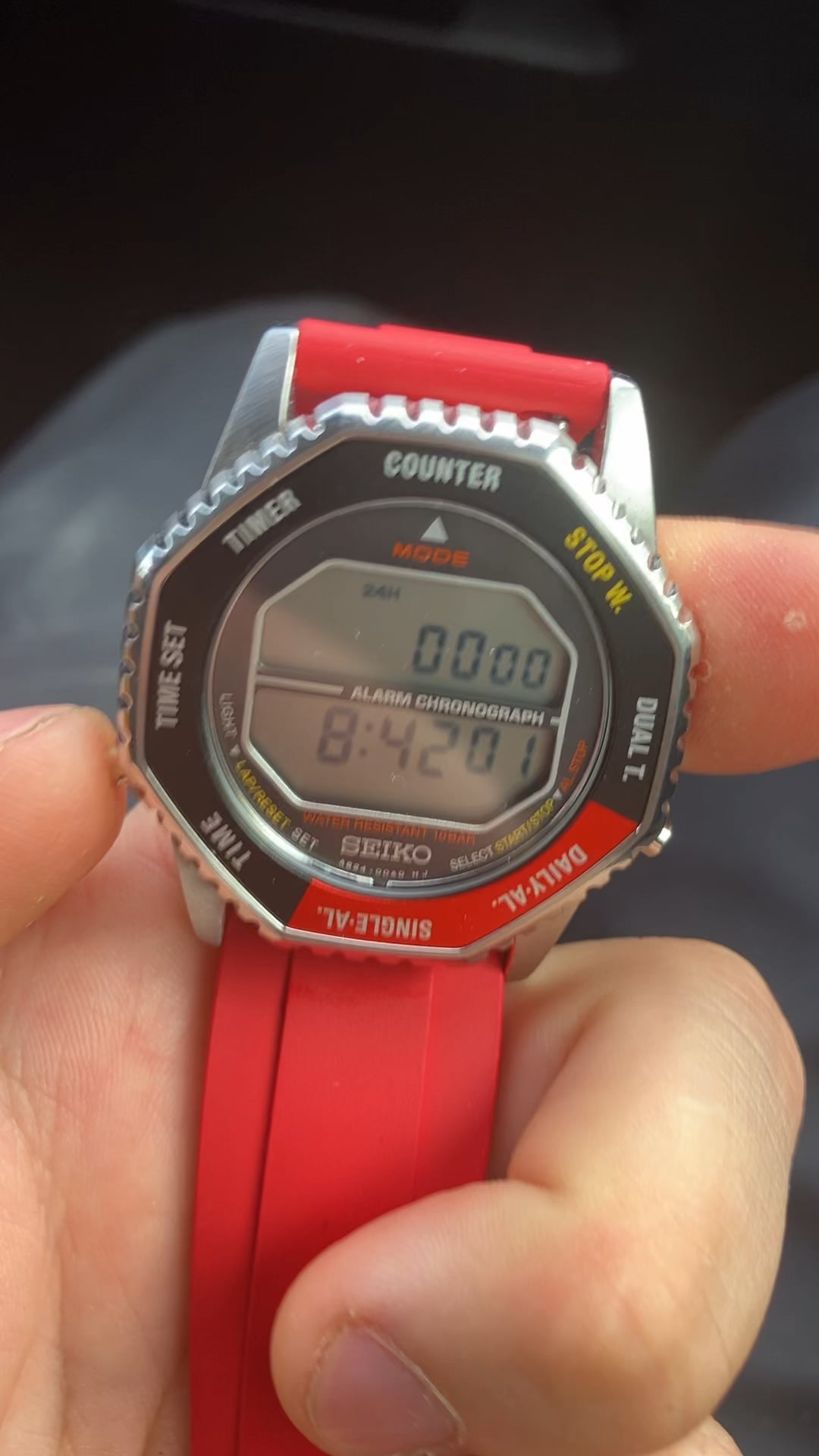 The best fishing watch I have ever seen! It has two clickers to count the fish you catch and of course it’s watertight. Seiko Rotocall.