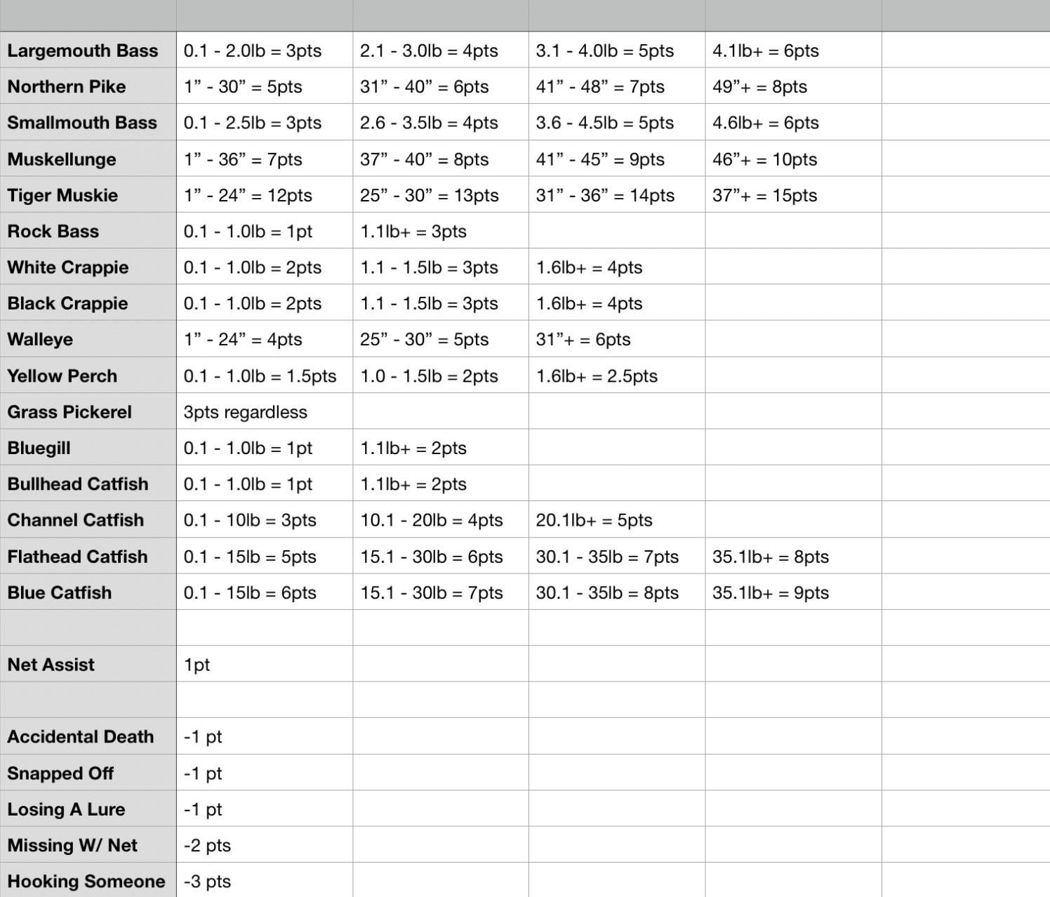I, my mom, and my friend have devised a points system for when we go out on our boat to incentivize multi-species fishing. Any recommendations to change points? Other penalties/rewards? Thanks!
