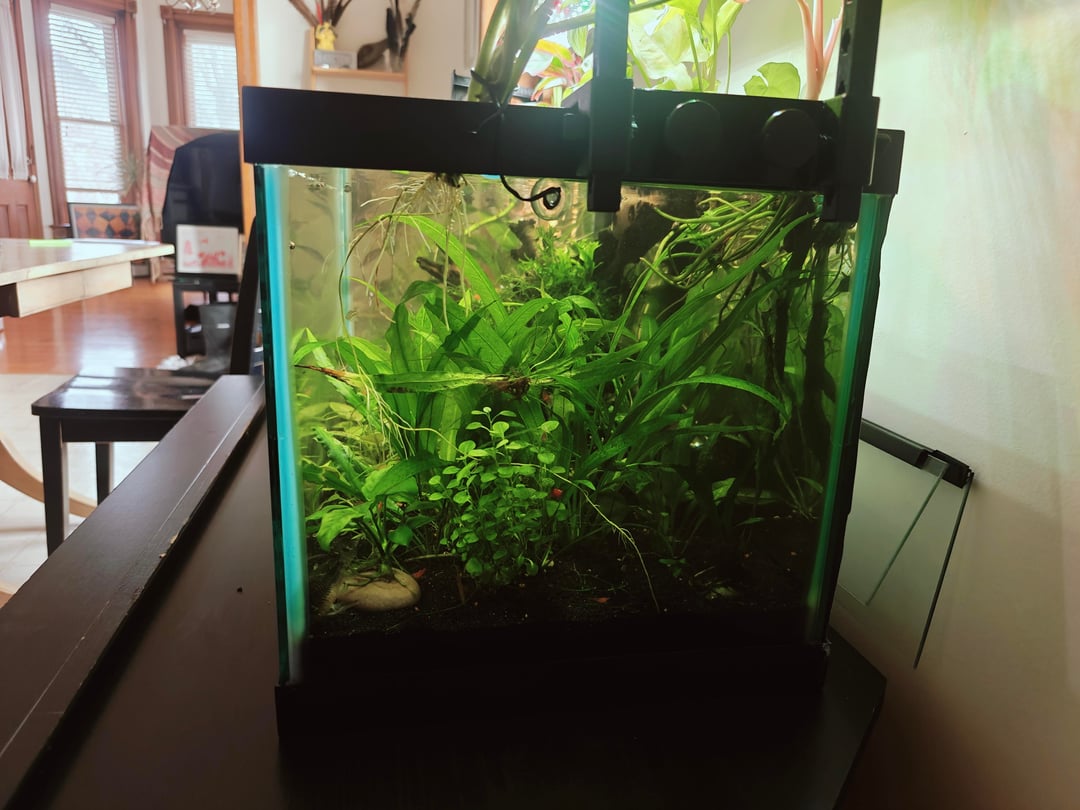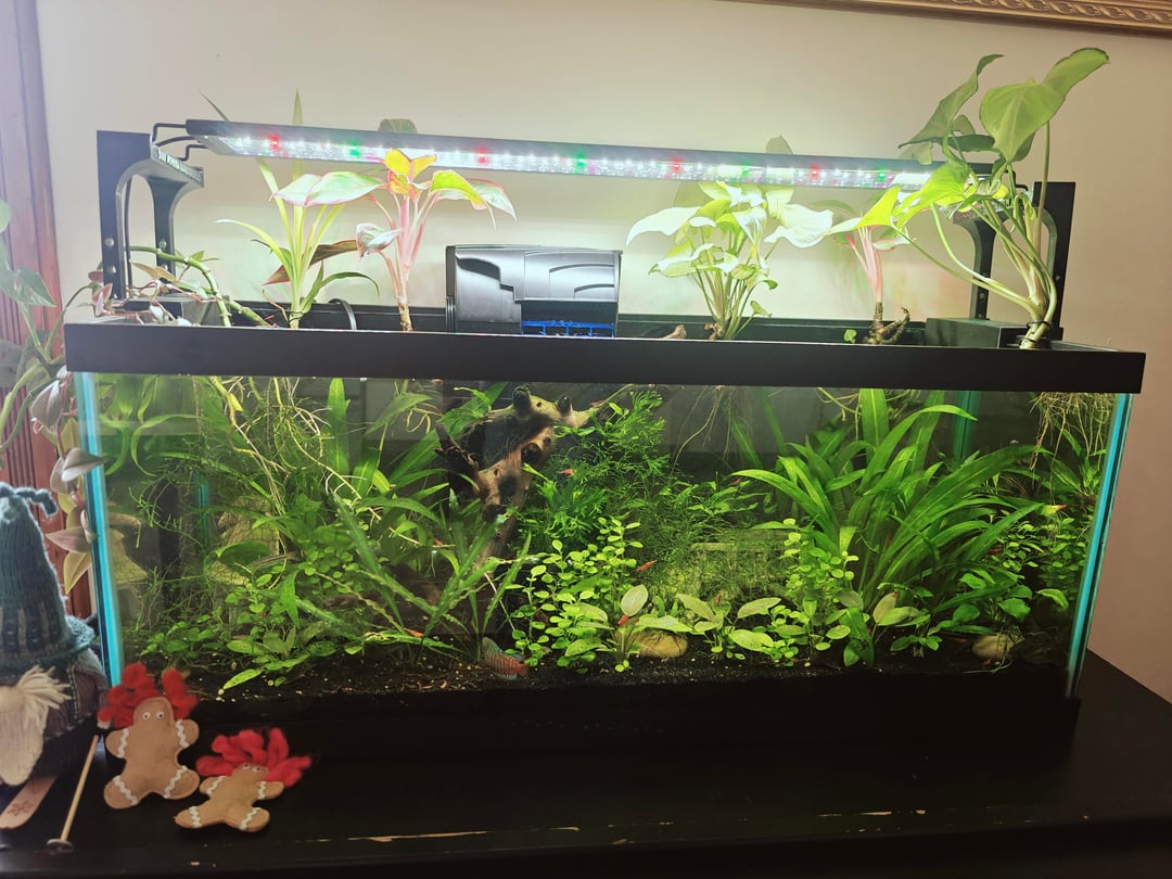 This is my 20gal long. I've had it set up for about 6 months. I'm really happy with the plants, but I'm wondering at what point are they taking up too much space for my fish?? I've got a HOB filter and I use a foam pad in it for the biologic filtration. And keep it heated around 75deg F.