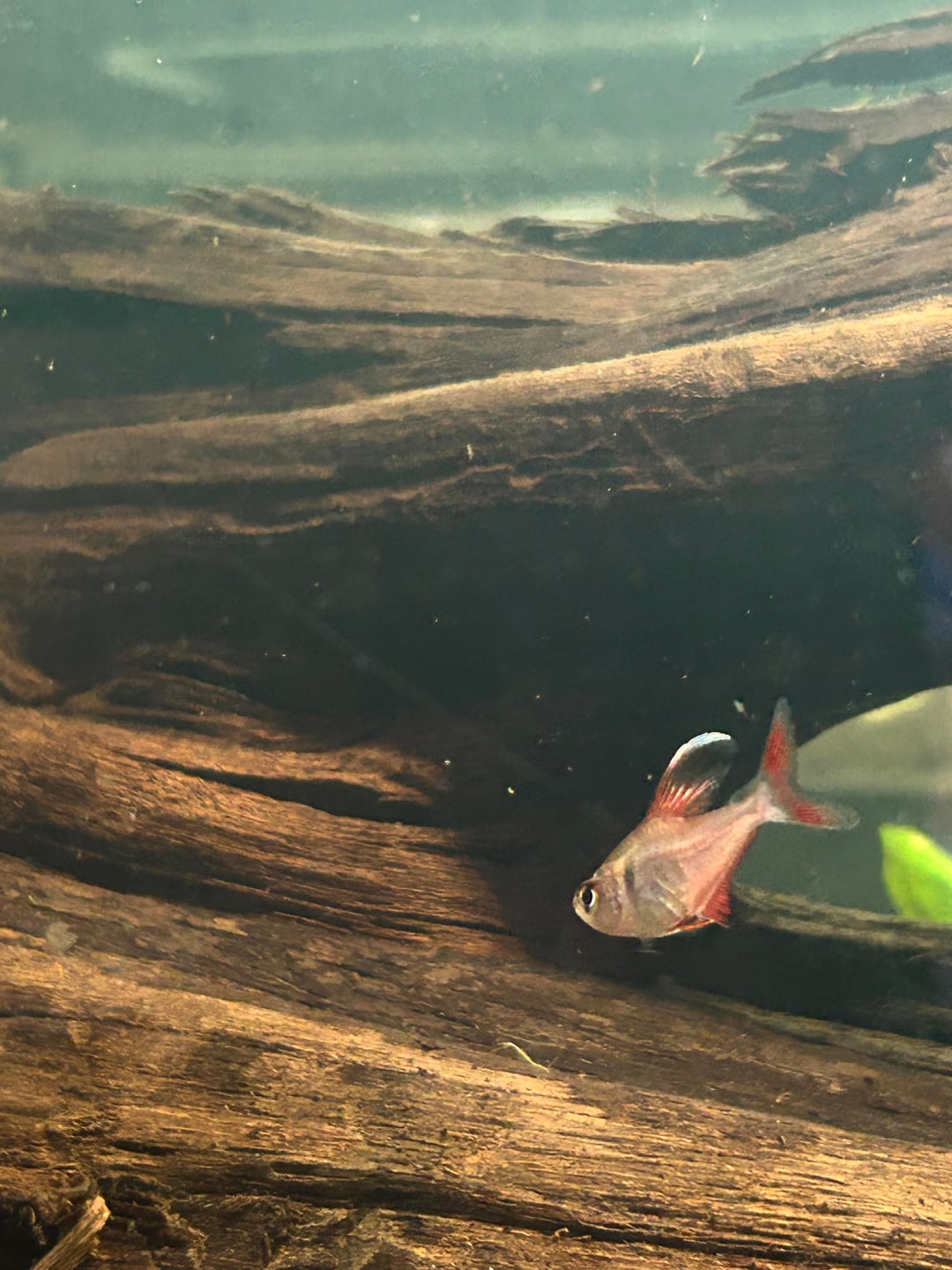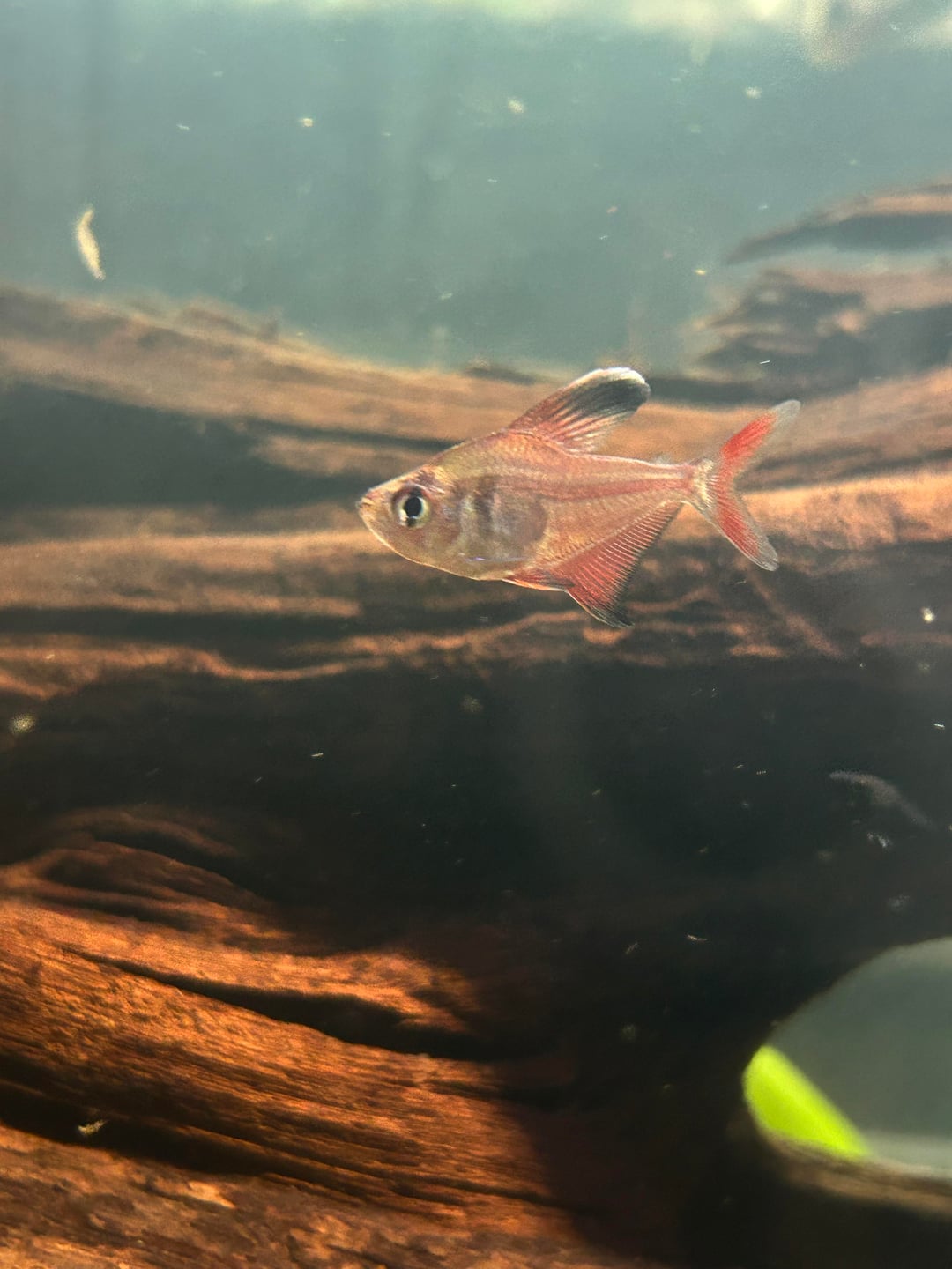 Brought home today in a group of bleeding heart tetras but we’re convinced it’s not a bleeding heart and possibly a type of rosy tetra instead? Beautiful fish regardless, phone camera doesn’t capture how bright he is