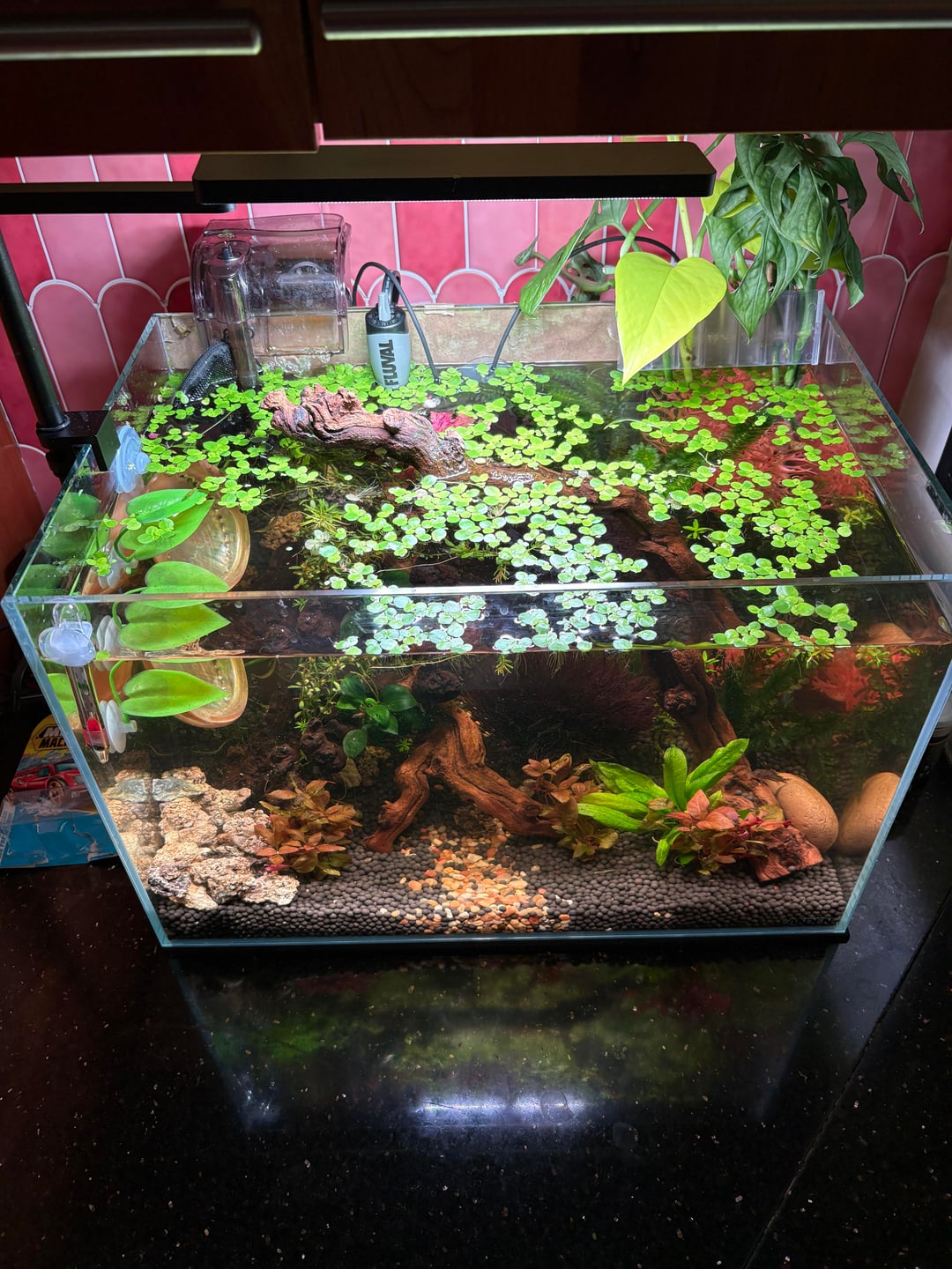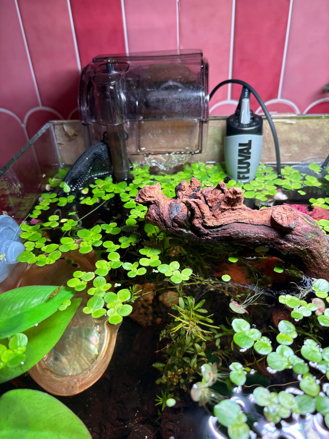 Right now I have a waterfall back hanging filter with the waterflow on medium, any higher and my betta does tumbles like he’s at a next level water park! But that really doesn’t do anything to move the surface tension, I’m sure all the duckweed isn’t helping 😣
