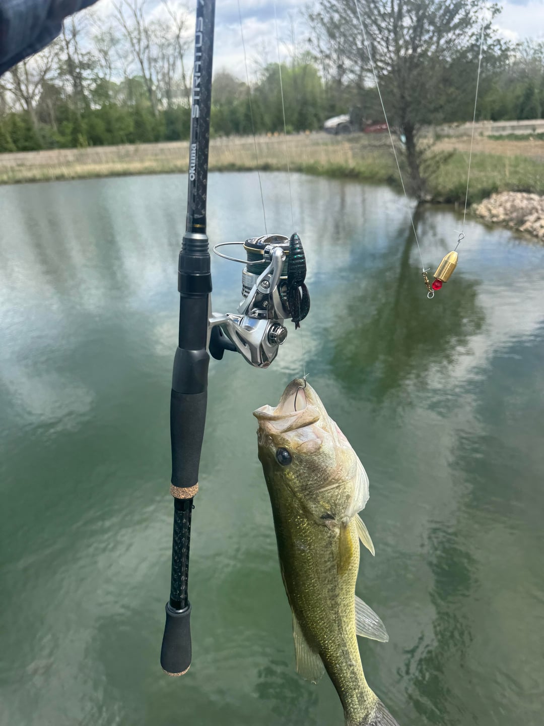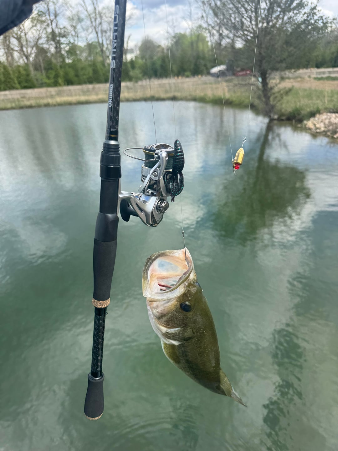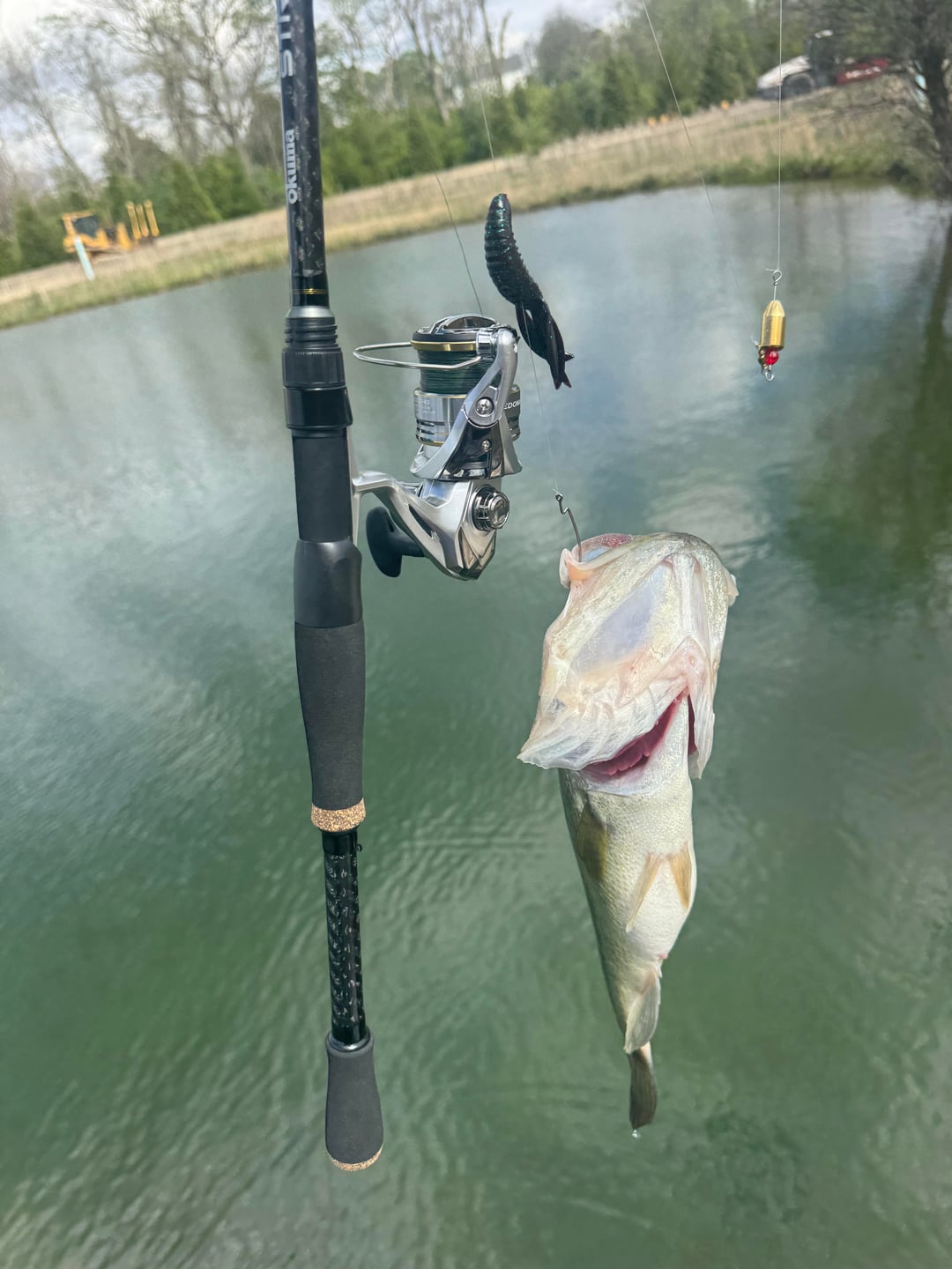 Caught on a creature (Berkeley pit boss jr. craw I think) rigged Carolina style, with a 3/4oz sinker about 2.5’ up the line. Trying out my first MH rod.