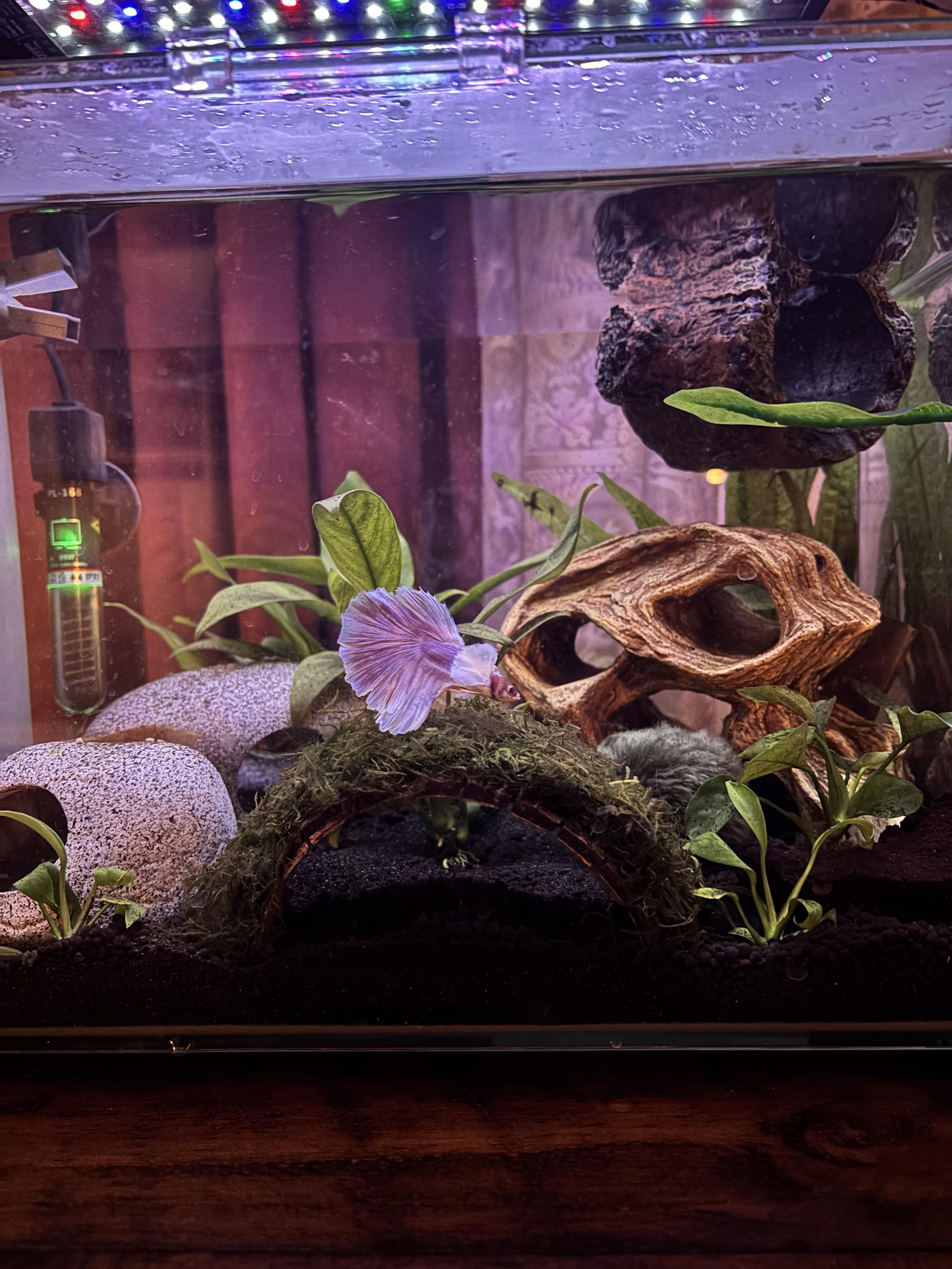 Introducing my new buddy Schmidt! Just got him yesterday, have been cycling his tank for a few weeks. I read somewhere about this specific breed not liking too strong of a water flow so I am concerned about the flow of water being too strong (the spout in the top left corner) any tips on how to reduce the flow? If I’m totally off base please let me know. Trying to give this guy the best life he can have! Also, if you have any suggestions or tips on how to make my tank better let me know as well I’m open to suggestions/criticism, etc! He’s currently in a 5 gal. I had the lights dimmed to the lowest possible setting in this pic because he was being shy once I acclimated him hehe