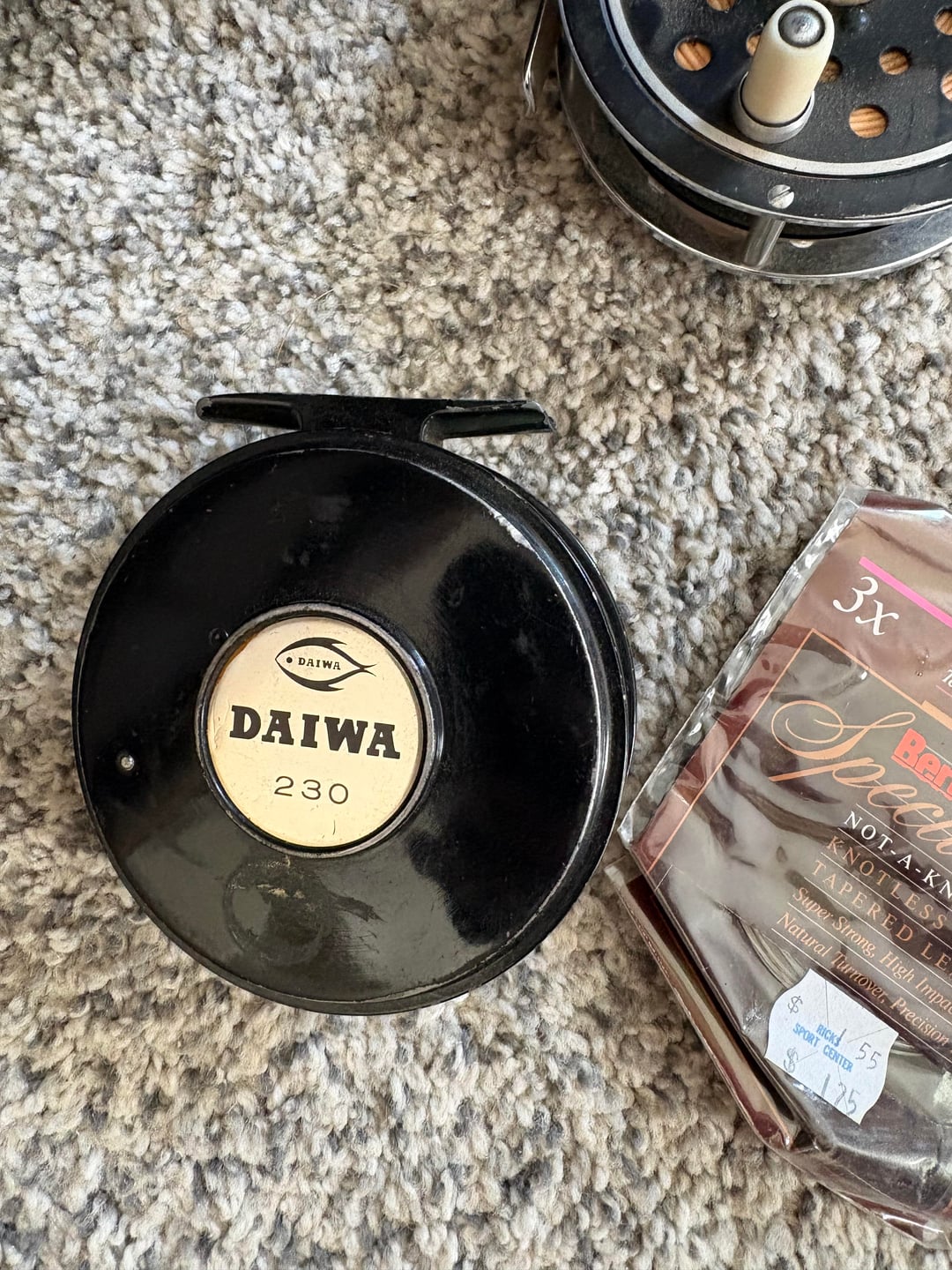 1. A pflueger medalist, old daiwa, unknown 5wt, old monofilament and plastic flyboxes?