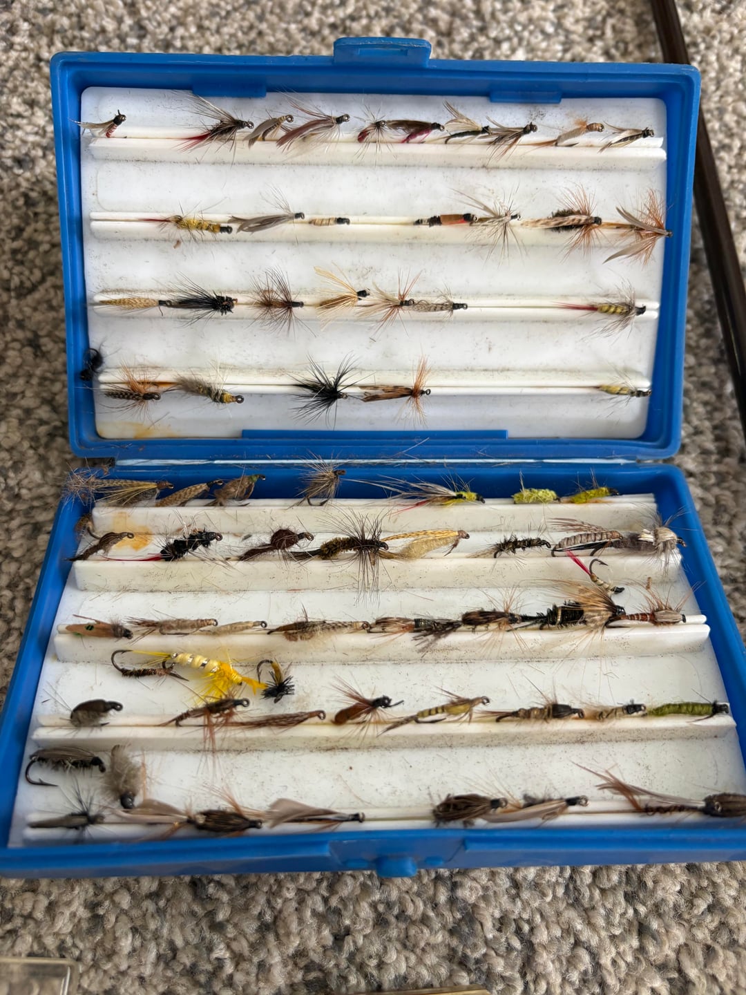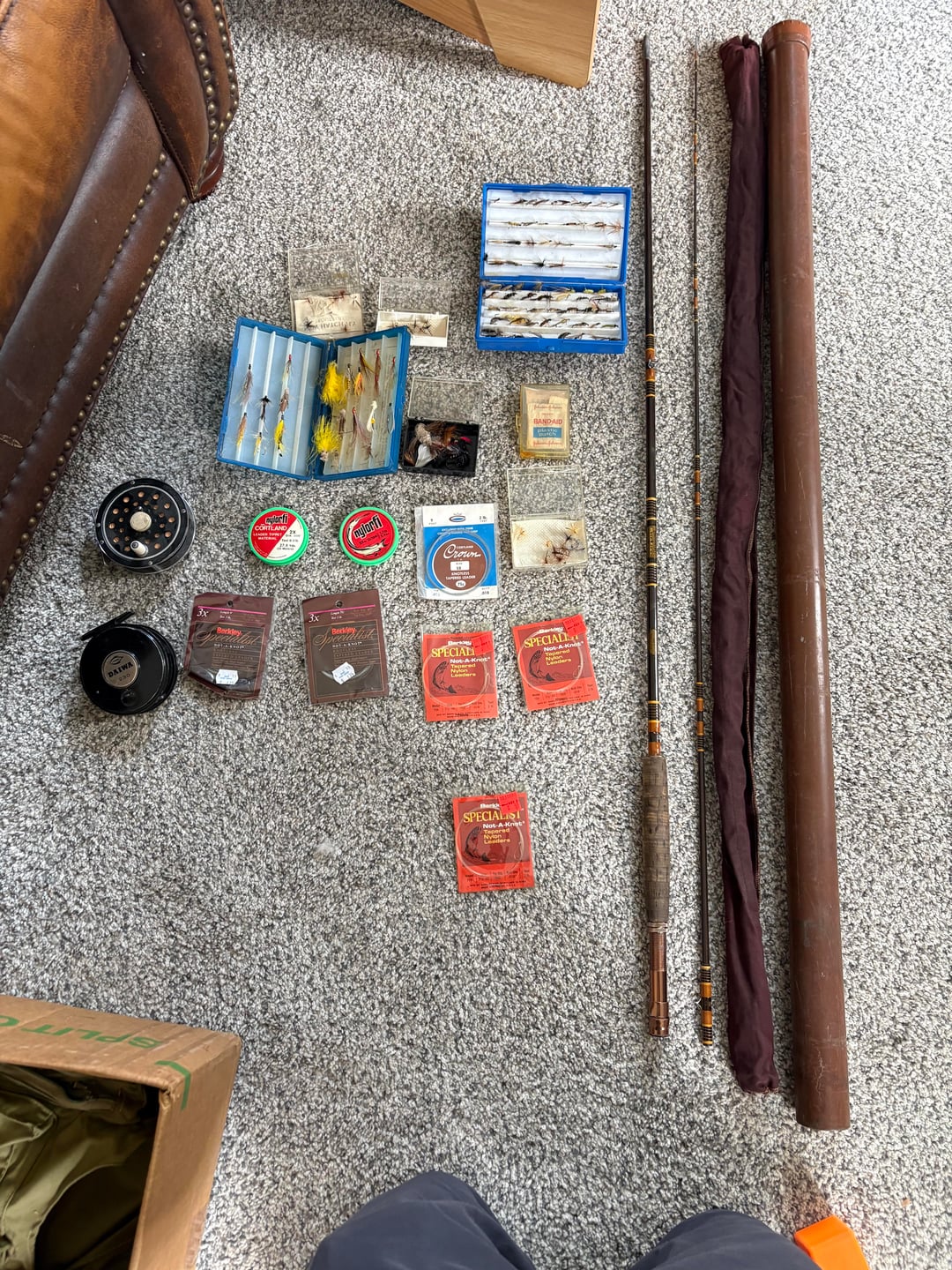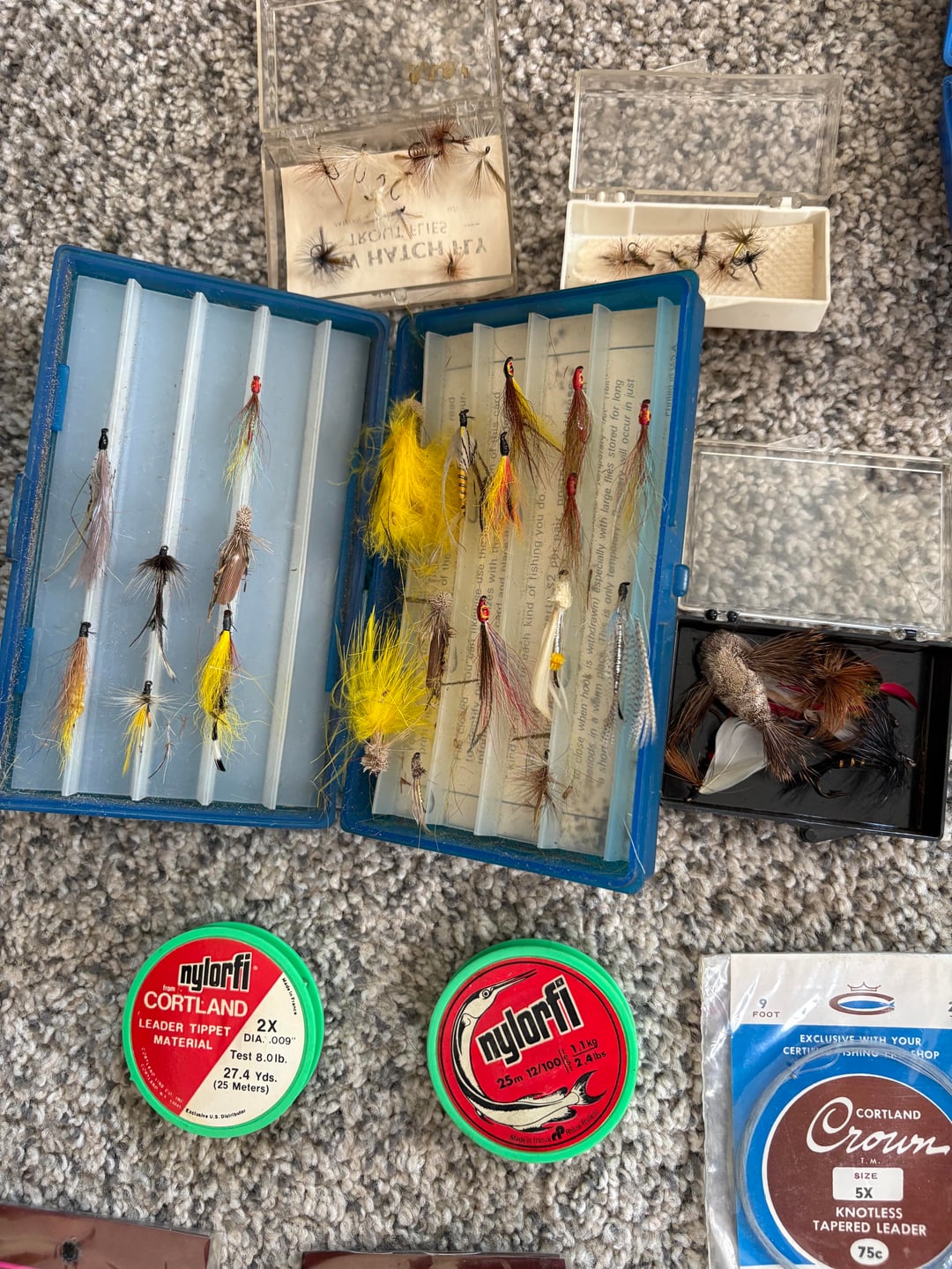 2. You did Ok. The Pflueger Medalist reel is the most noticeable item of value – old nylon is a crapshoot tbh – heat cycles and UV radiation are relentless killers of mono. May be Ok tho. I’ve not seen a 7.5x leader in a while. The fly boxes and fly patch are reusable – but the flies look mostly knackered IMO. Get a 5wt floating line and sting it up and start fishing!