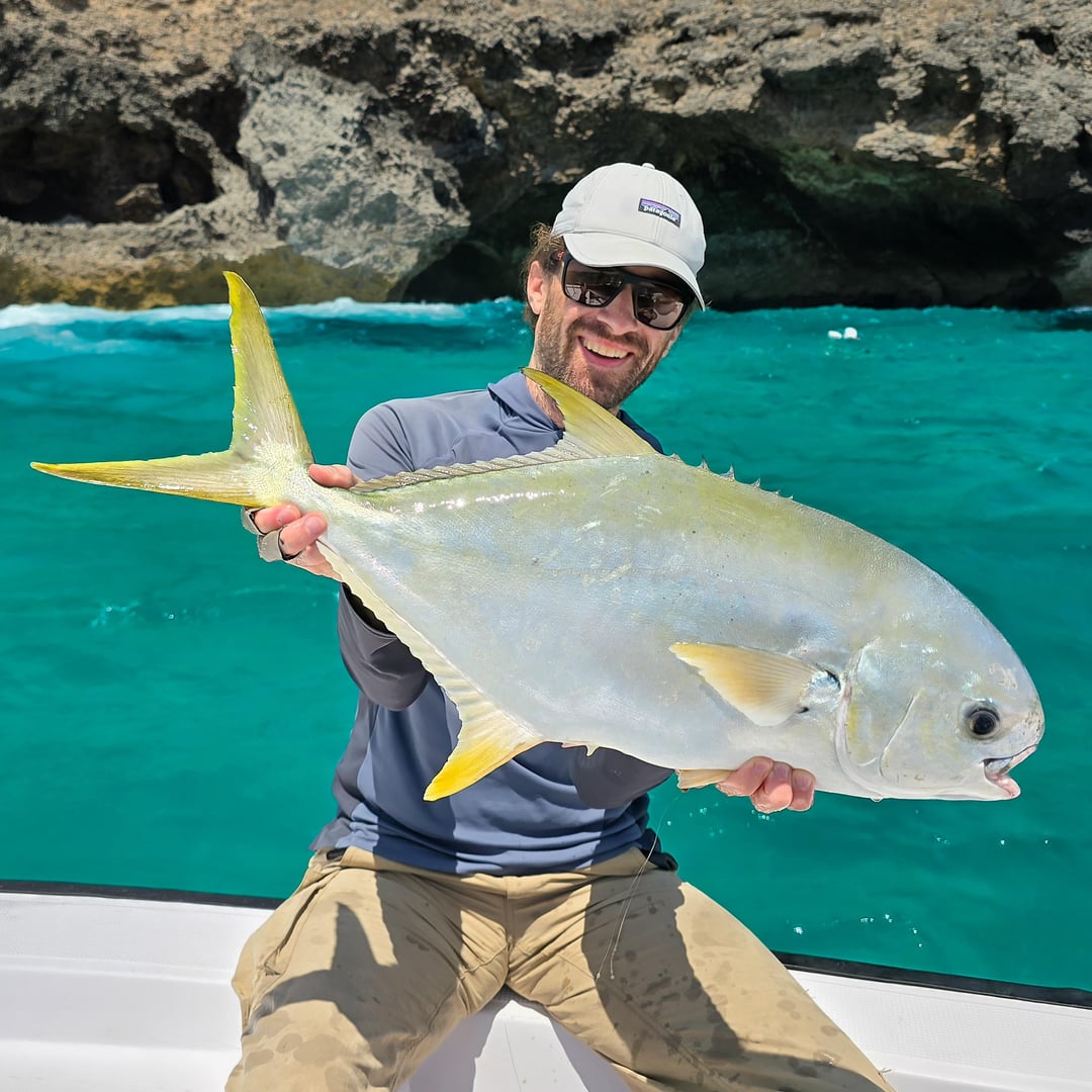 The absolute highlight is the African Permit. Anyone who has fished for Permit before knows: it's a war of nerves. We spotted them in turquoise water, had to cast in heavy surf and with the boat pitching badly. Not always easy… Setup: 10-weight rod (needed for the power of these swimming muscle-packages). Fly patterns: heavily weighted mussel imitations (Black Mussel) and small crayfish patterns. Epic bycatch: Two-bar Seabream often run alongside the Permit. When you see those orange fins, your pulse spikes — even if it's "just" bycatch. The takes from both species are usually anything but gentle.