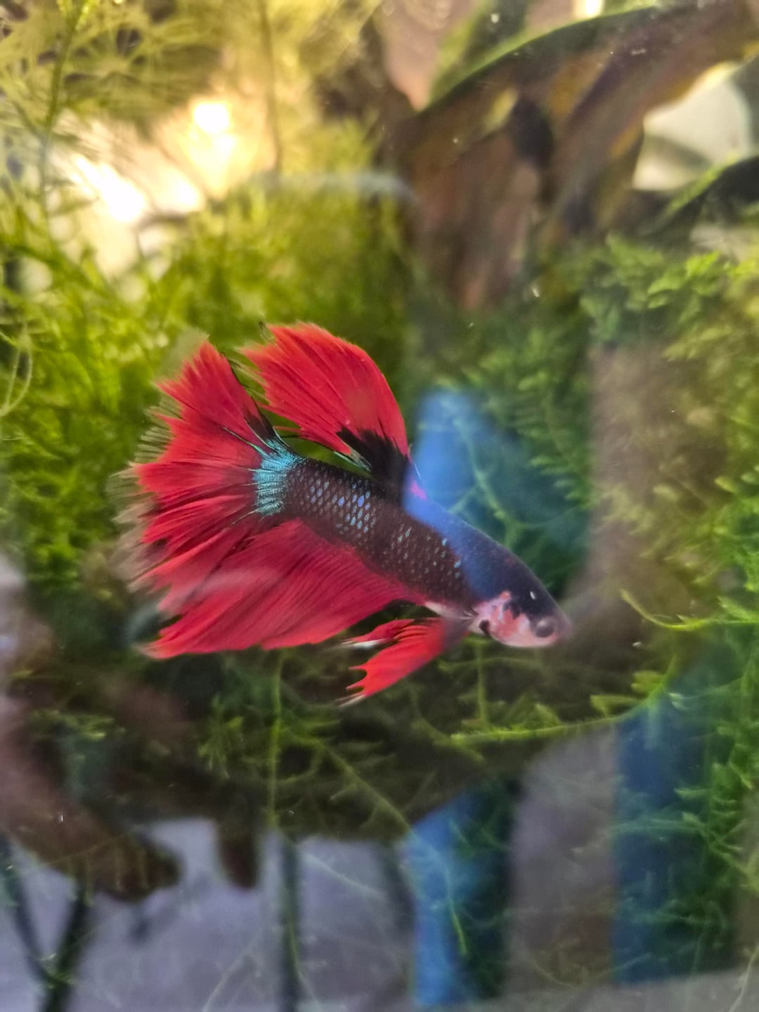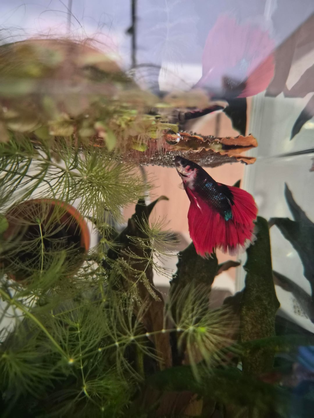 He seems like a chill dude. My first betta never bothered shrimp, so I was a little bit worried about bringing a new betta to their home. They were having a meeting on my red root floaters when he was set free in the tank, he swam to them and left them alone so 🤞