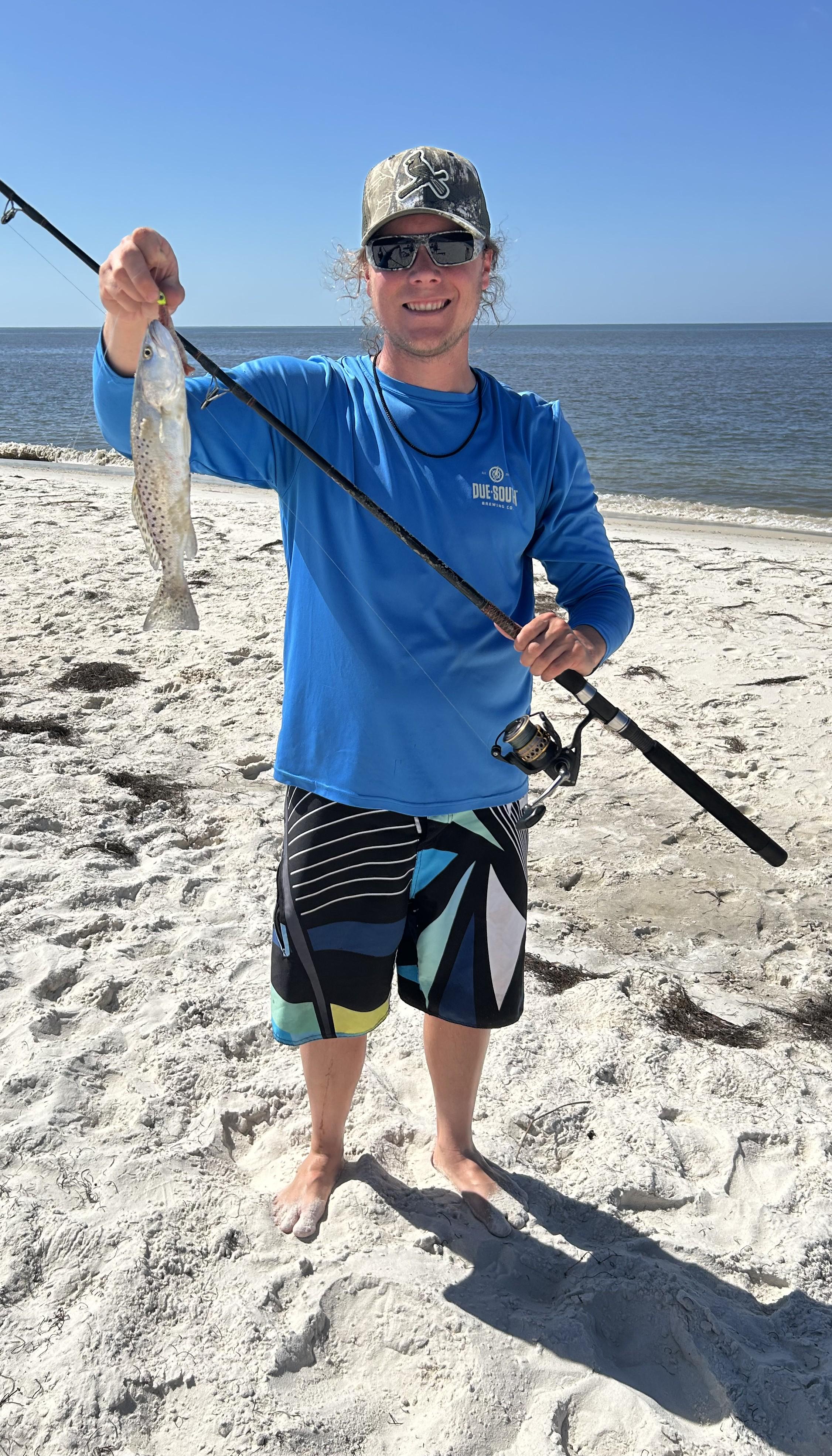 Seatrout are starting to show up to the beach near Tallahassee. Caught on a popping cork with a gulp shrimp.
