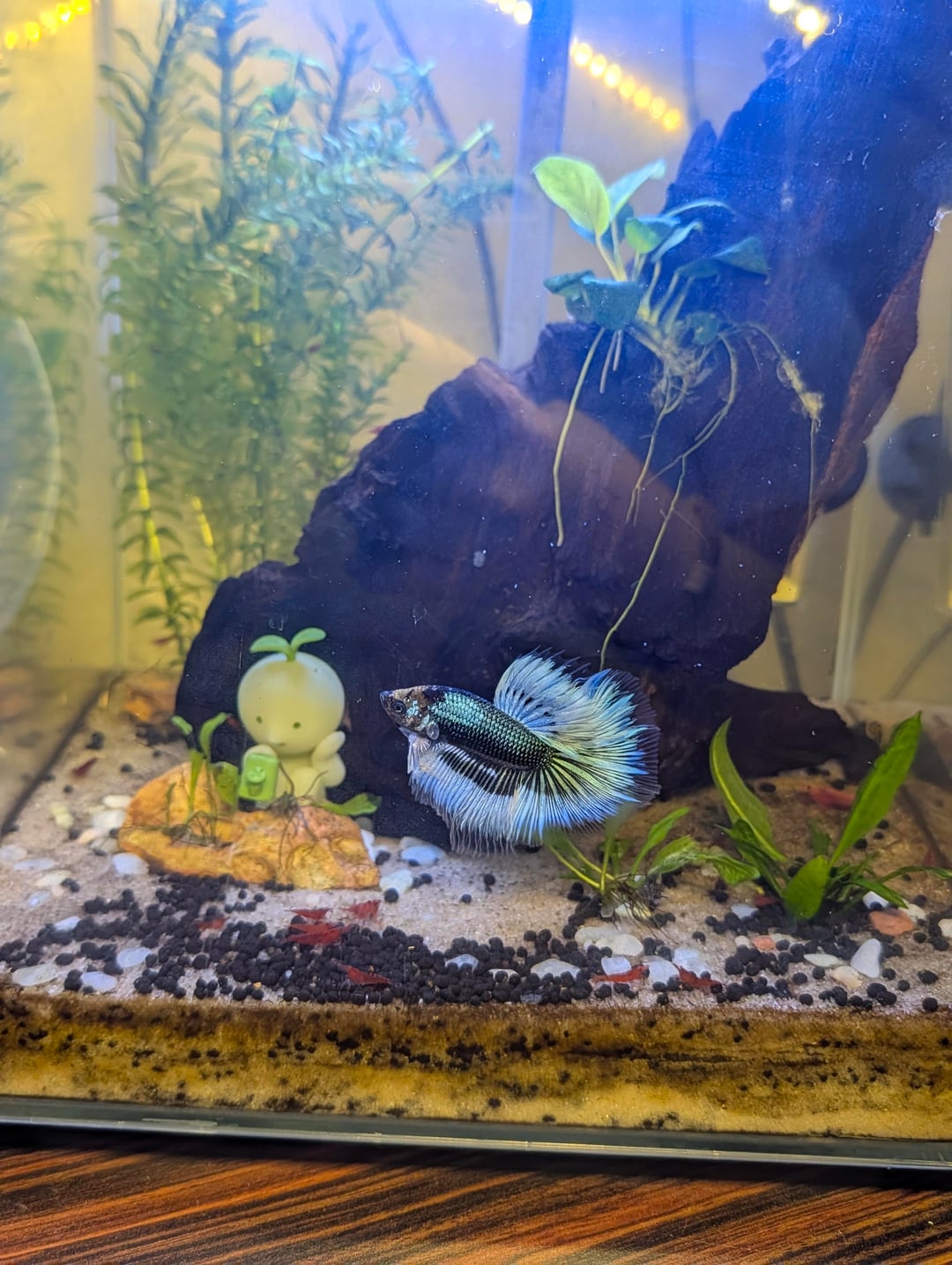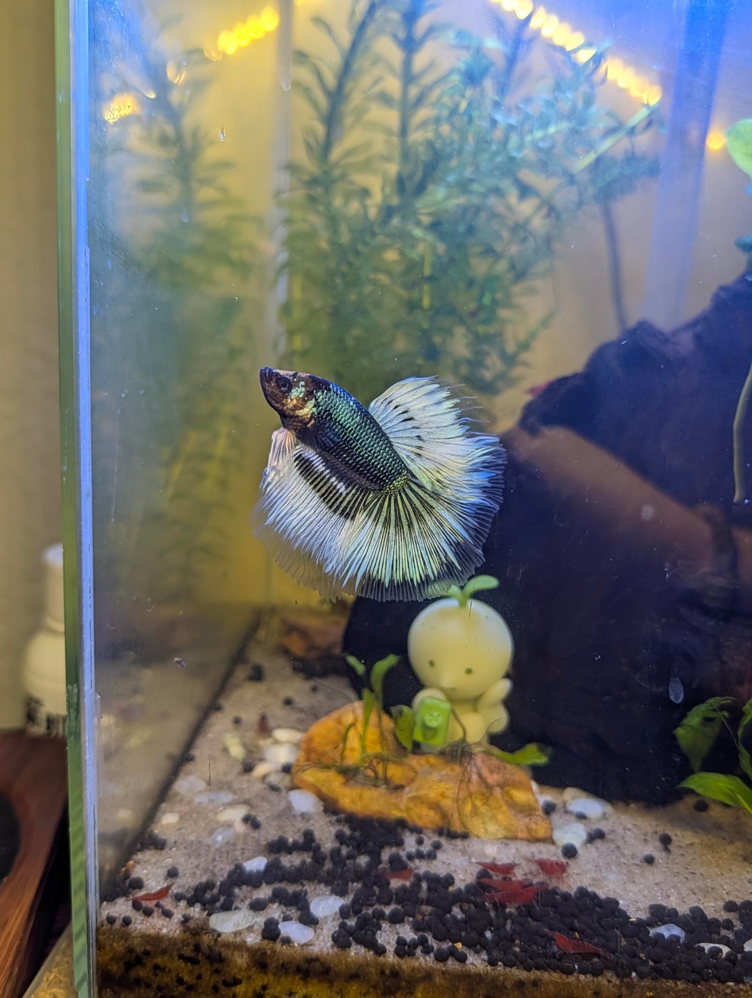 He's adjusted fantastically, he's incredibly active and a very strong swimmer for a halfmoon, and no issues with tankmates other than chasing the occasional shrimplet. .