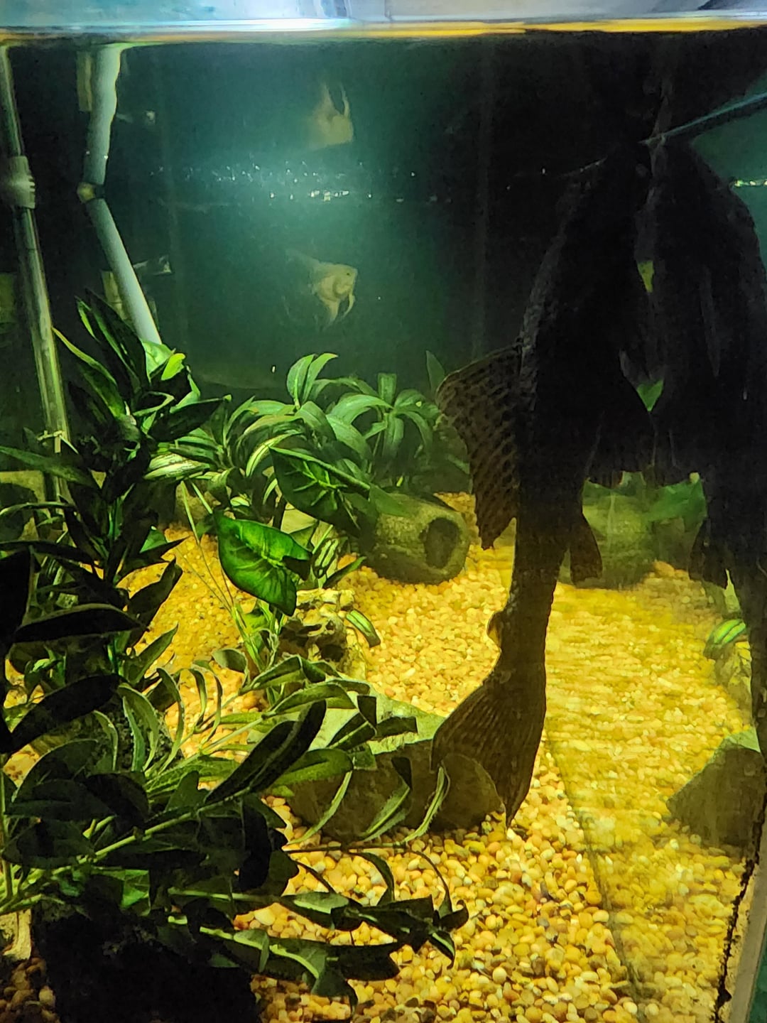Contains: Bala Shark, tetras, and an angel fish that might have killed all its mates… (plants are fake cus mr pleco is a hungry goober)