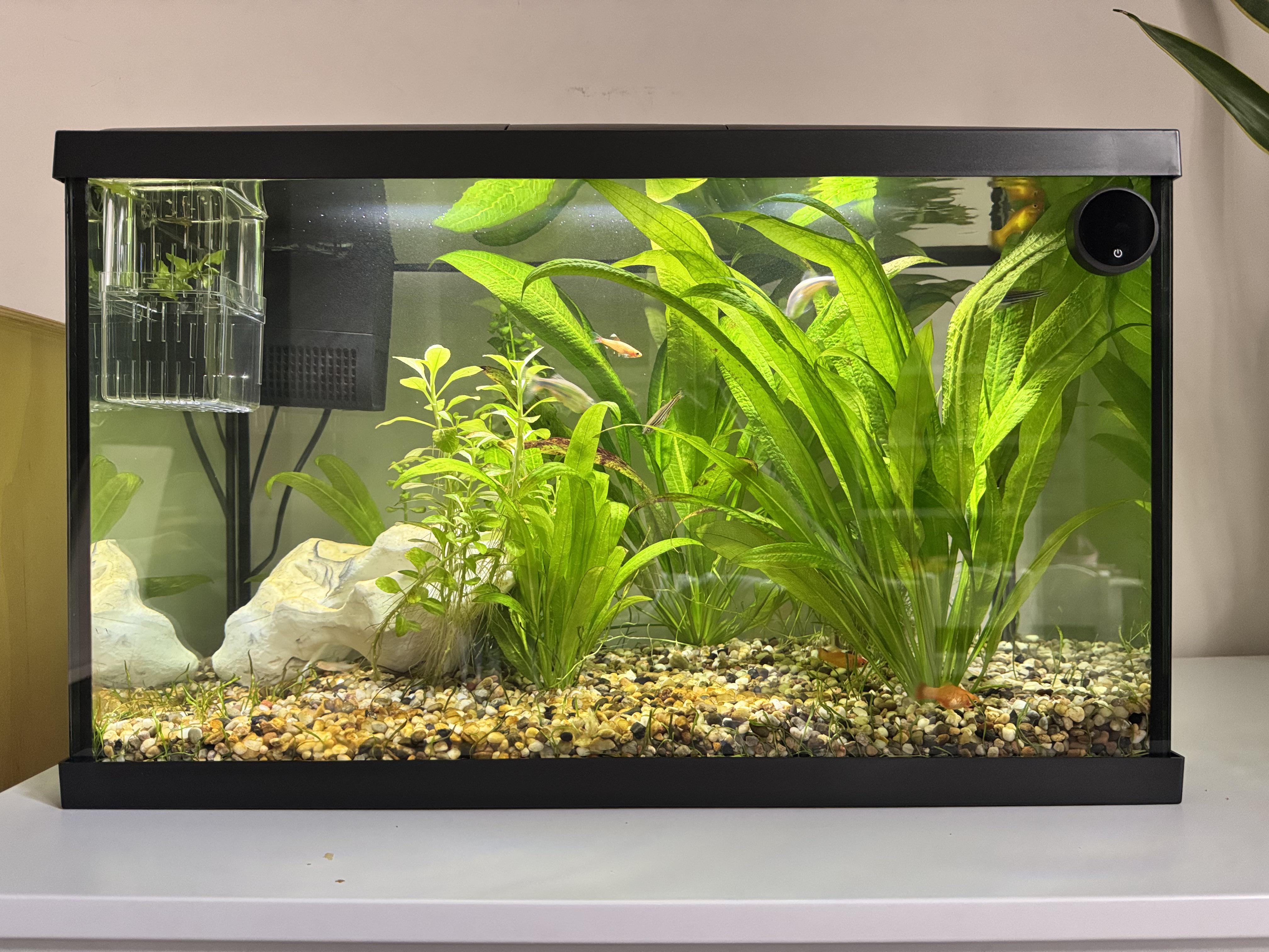 We currently have 3 Platys, 5 Danio and 3 cloud minnows. It’s a 56l tank. Temperature and water tests are all very good, but we do live in a hard water area.