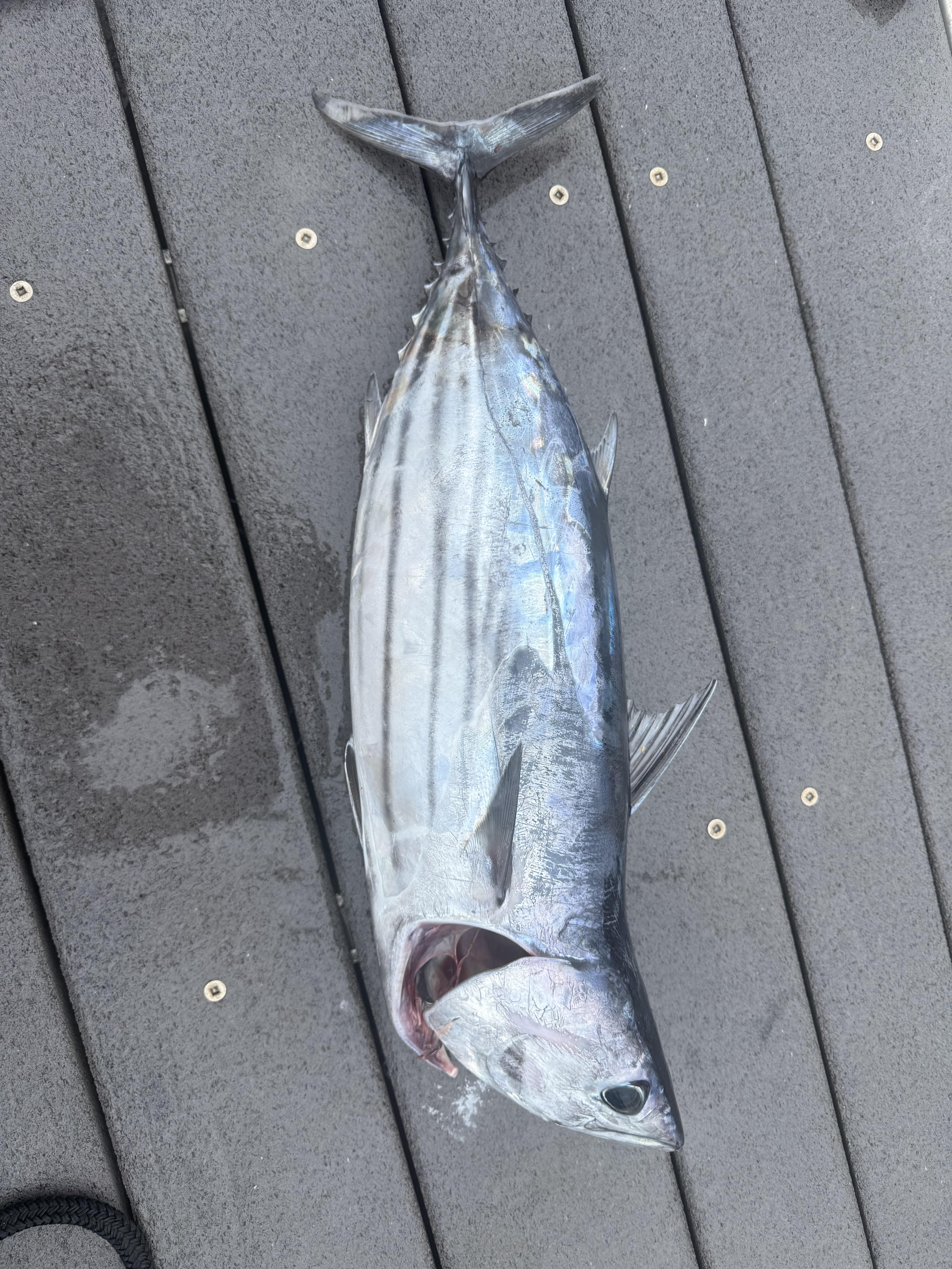 Headed out to about 850 feet deep off West Oahu and saw a giant bird pile. Then noticed Aku (Skipjack Tuna) launching out of the water hitting a bait ball. Had some Aku lures out back trolling around the surface action. Had a second one on but lost it. It was truly exhilarating to be in the middle of the feeding frenzy. Made some poke and tonkatsu aku with the filets. Really delicious.