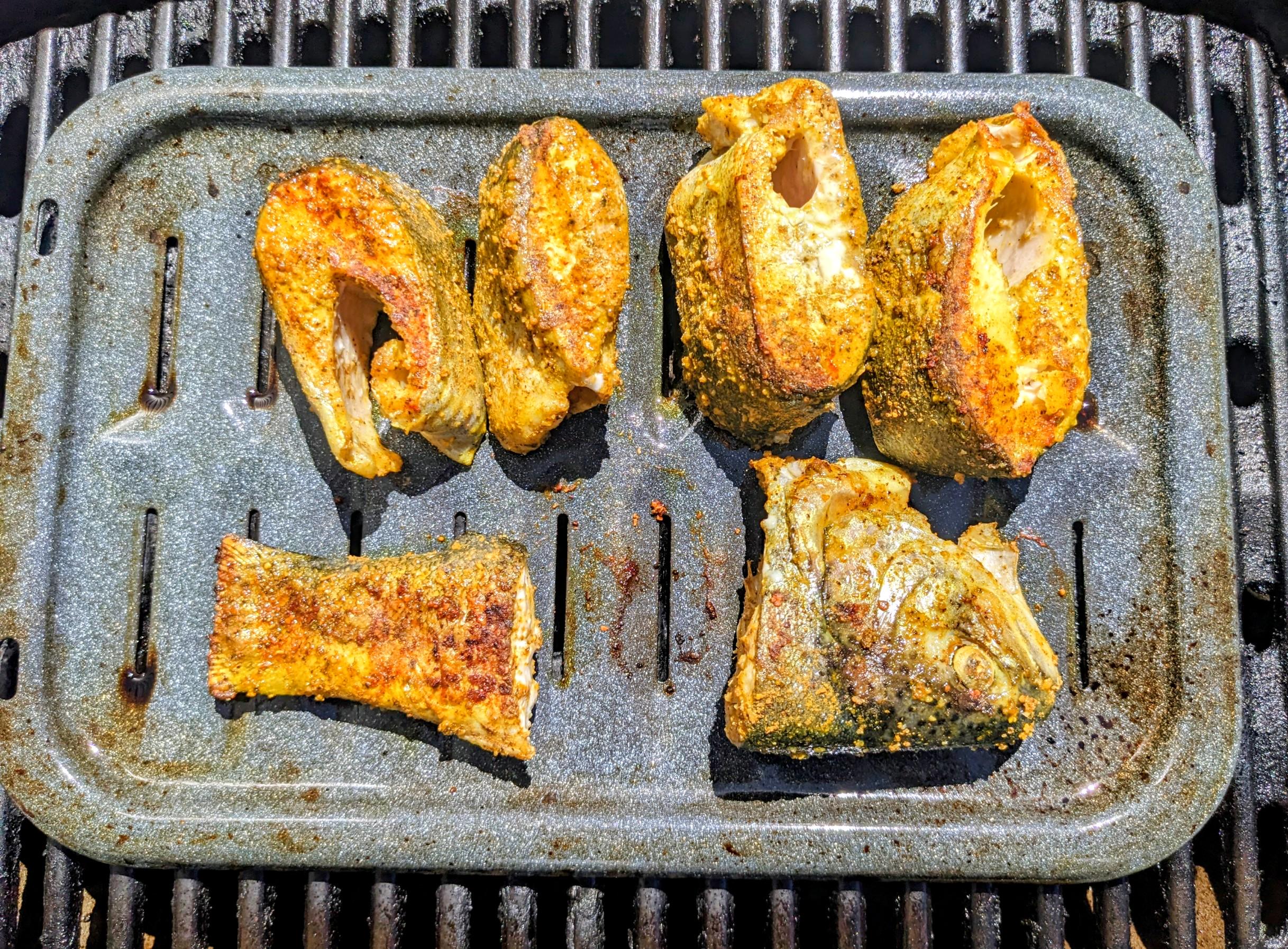 Grilled trout with turmeric, cumin, and pepper. What spices do you typically put on your grilled trout? And do you have a better technique than mine to make sure that the fish doesn’t fall into the fire.