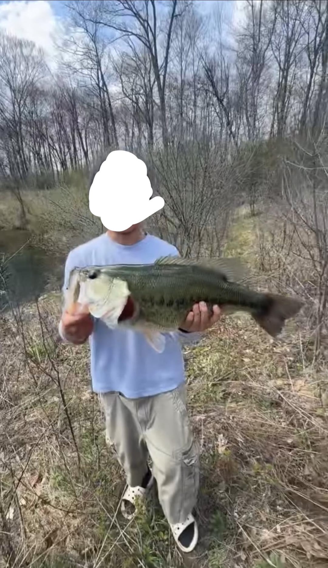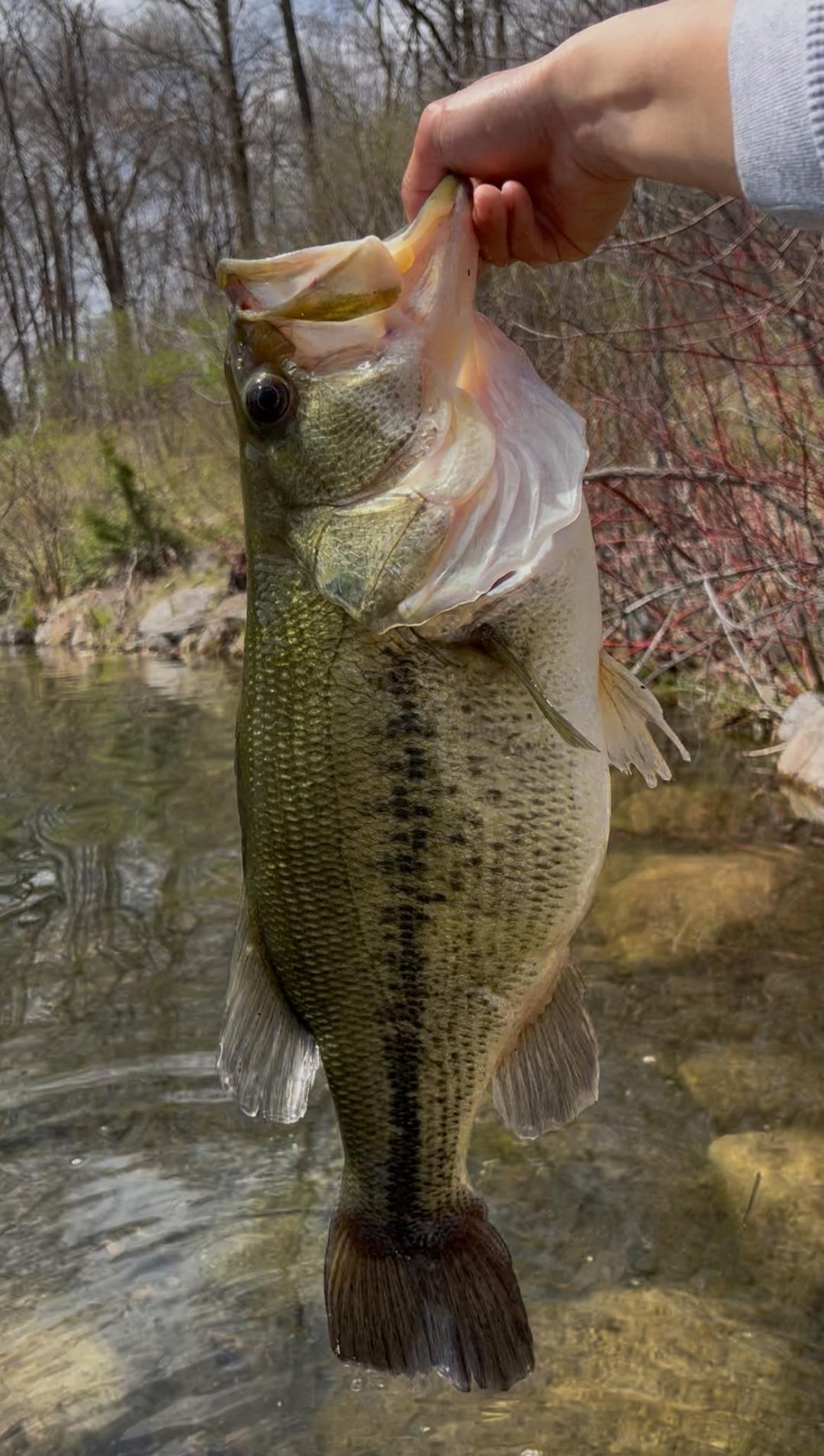 Before I caught this gal, I had a jerkbait tied on to fish along the drop off as there were bass just swimming along it all around the bank. Sight fished and watched a LMB chase my jerkbait in and eat it, super sick watch. After that, didn’t get anymore bites so I decided to switch to a ned rig with a strike king ragetail. Right as I was tying it, I looked up and to my right and saw a small bass swimming by and decided to speed up my knot so I could catch it.