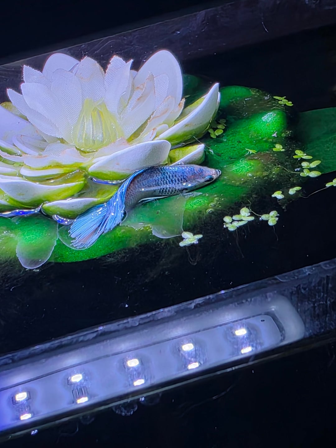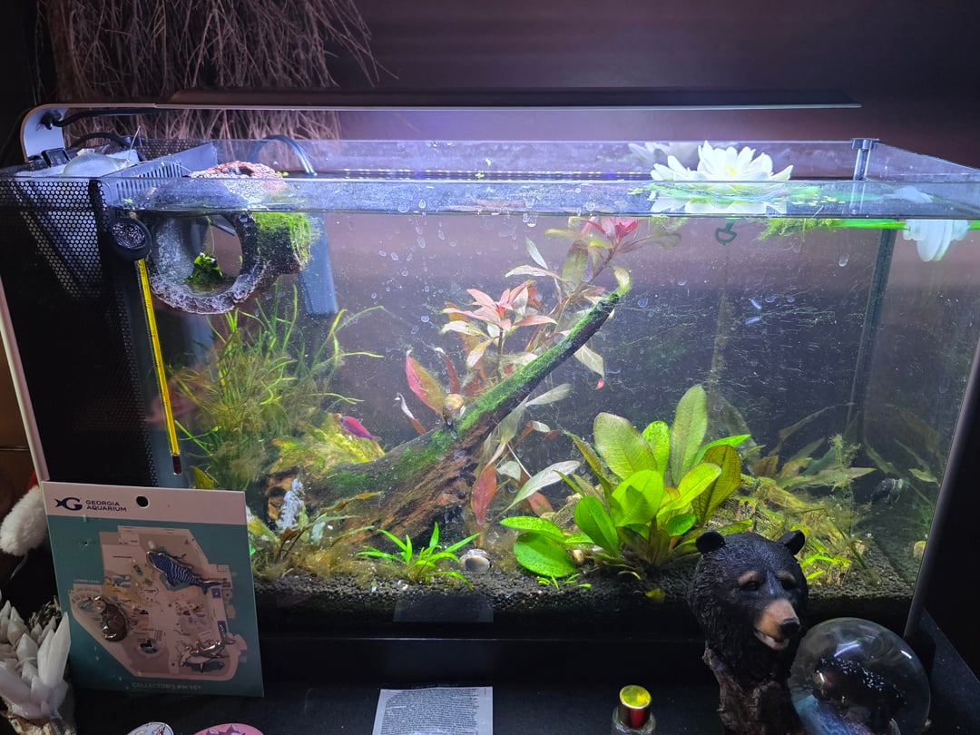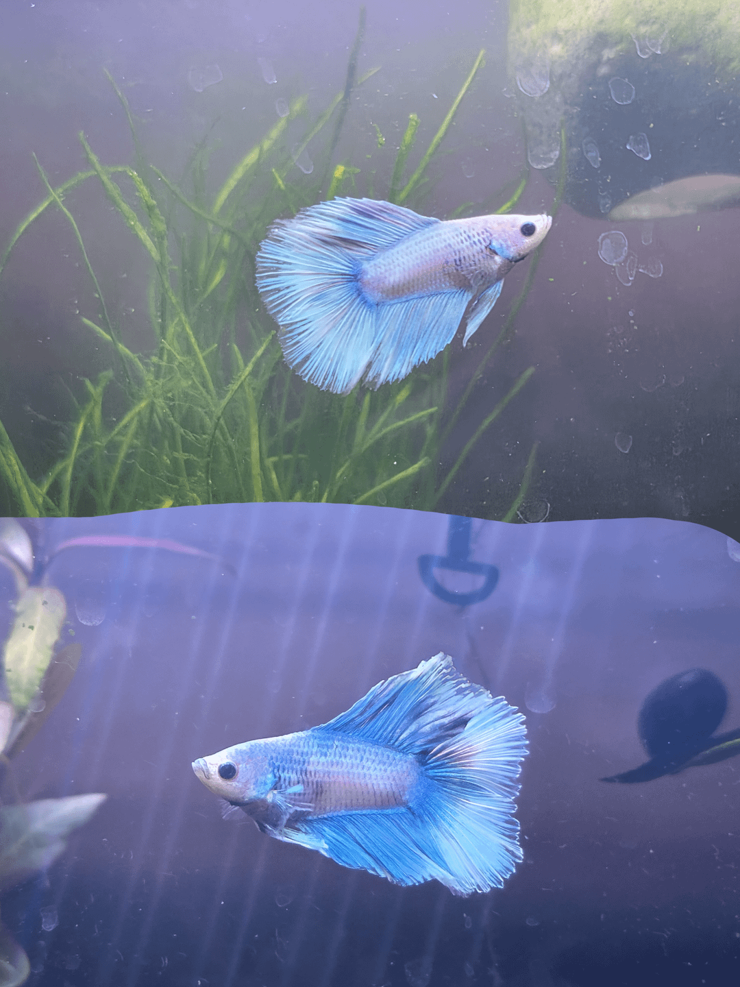 I've had this twin tail half moon male for two or three months now and he's doing great so far. He's getting a lot more blue as time goes on(picture 3 one month ago v yesterday), but today he was a bit lethargic. So, I cleaned my tank about 40 ish% water change, swapped out filters and my temp is riding the consistent 79-80°. My tank is all live plants, snails, a coreycat, and a few tiny algae eaters to maintain the ecosystem.