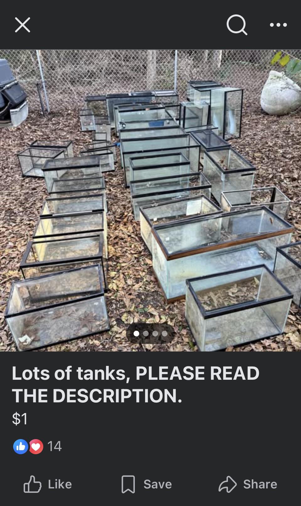 They’re selling all tanks at $1 per gallon – 😳 mix of 10-40 gallon tanks