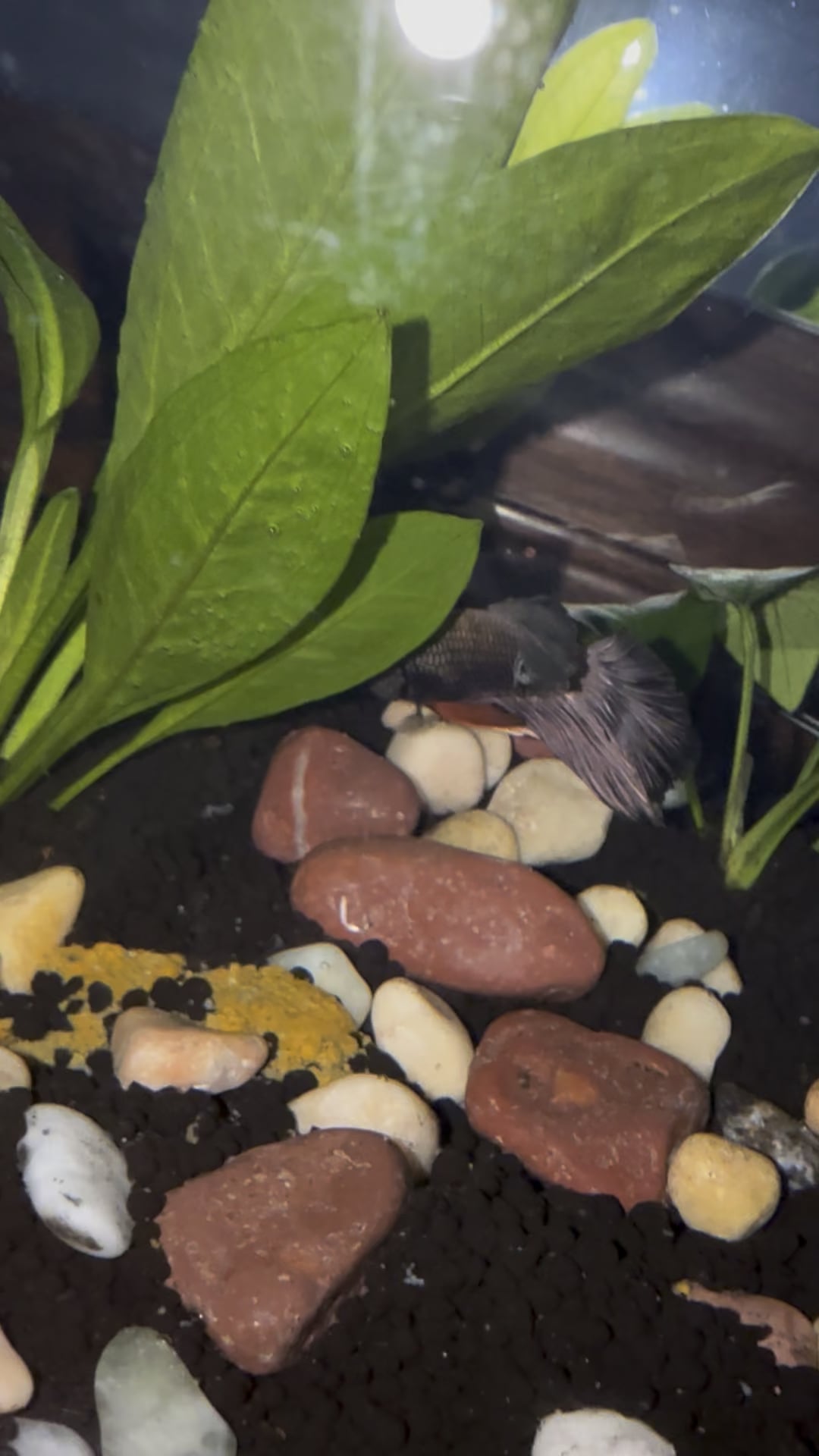 We bought a starter tank today, put in three live plants with aqua soil and pre-conditioned water. Fin Diesel is a Rose Petal betta. We haven’t had a betta in ages, so we’re pretty much ‘new’ to them again. Any constructive input is gladly welcomed! Will post a full tank pic in comments. (The yellowish stuff on the soil is from root tabs, they turned that color. Is that normal???)