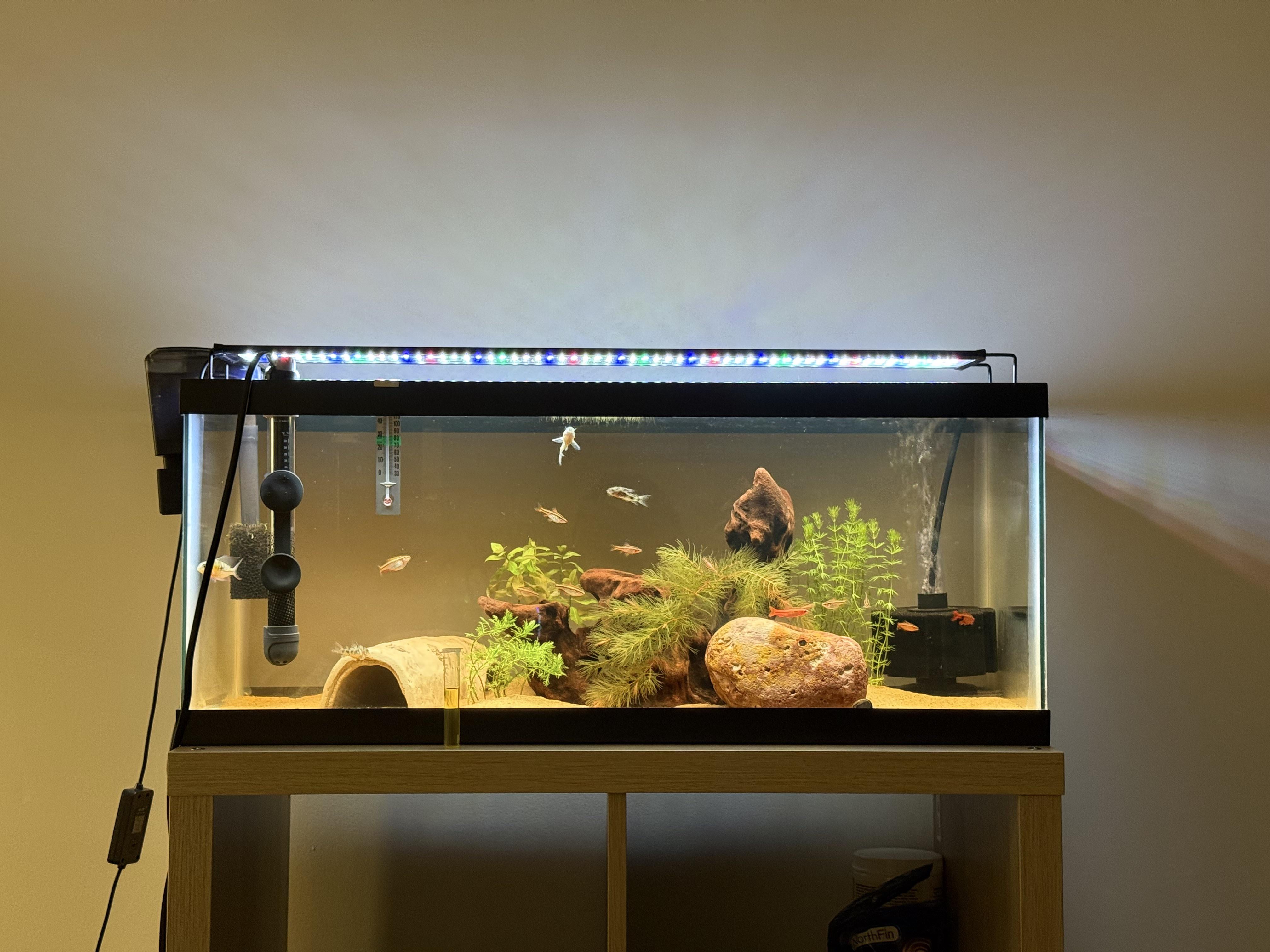Currently have a planted tank with 6 peppered cories a male bolivian ram and 10 cherry barbs. Have a AC20 Hob filter and a 50 gallon sponge filter. Is this essentially the max amount of fish I can keep or could i maybe add another school of fish and/or a female bolivian ram.