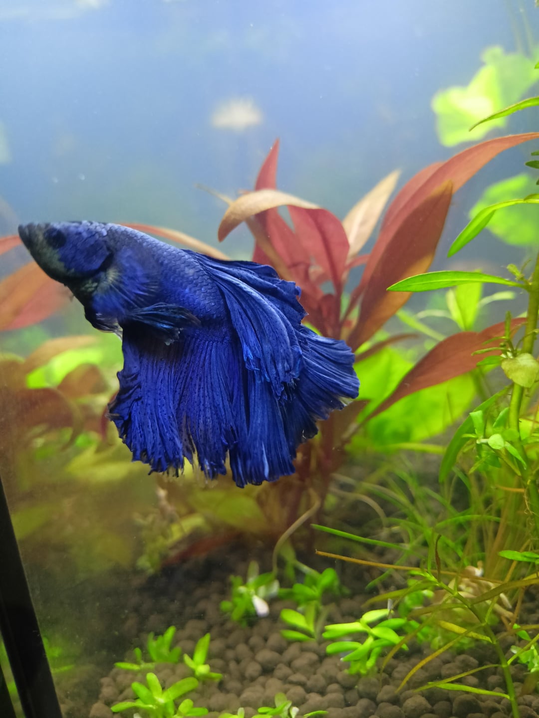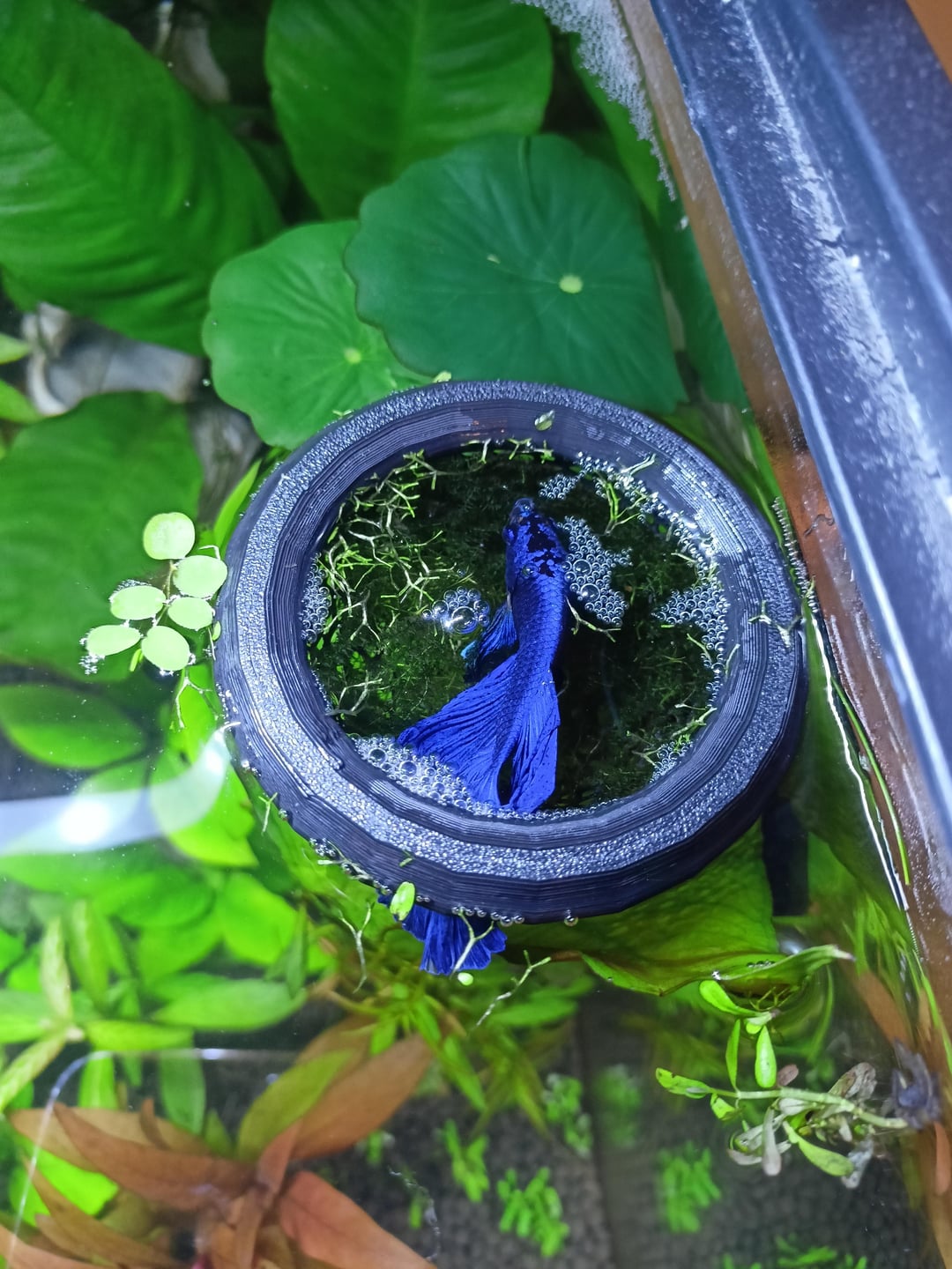 I recently added a black plastic Betta bed filled with moss. I recently did a big reproduction chop of my tallest plants and the Betta now has only the lotos, fake plastic plant, 2 Anubias leaves and the filter to rest on. But he favours the Anubias leaves when awake and when sleeping the Betta bed.