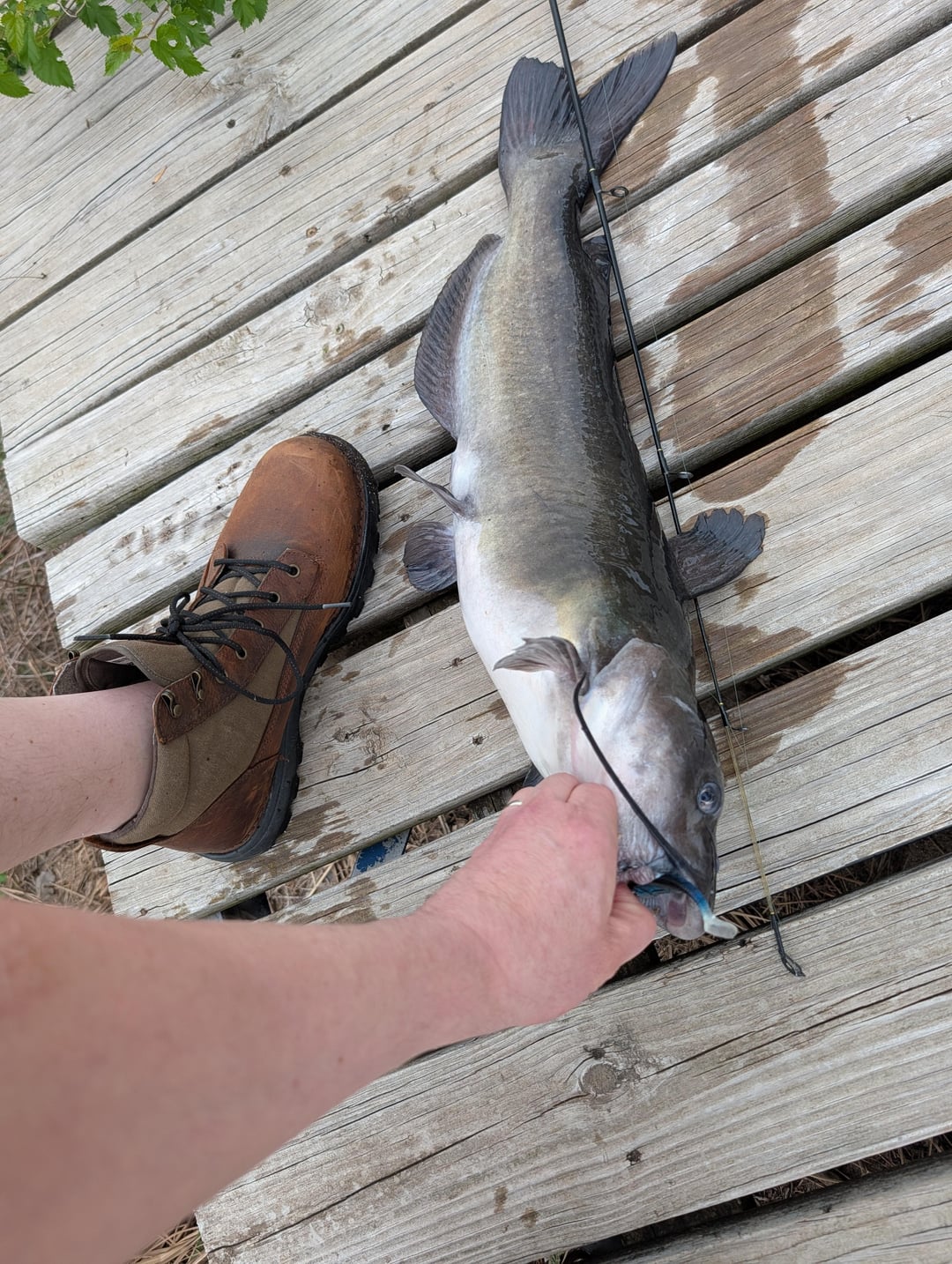 Fishing a friends sand pit lake, first cast on the drop. Thought I had a huge bass, but not that disappointed to get this channel. Size 12 boots for reference. Caught on fairly lite tackle. Had to get off the dock and step into the cat tails to get him out. Bastard bit the hell out of my thumb. Kicking myself for forgetting my net and lipper. Then caught around a dozen lmb the size in the second picture. The cat seriously chewed up the swim bait and it eventually fell apart. Great morning fishing!