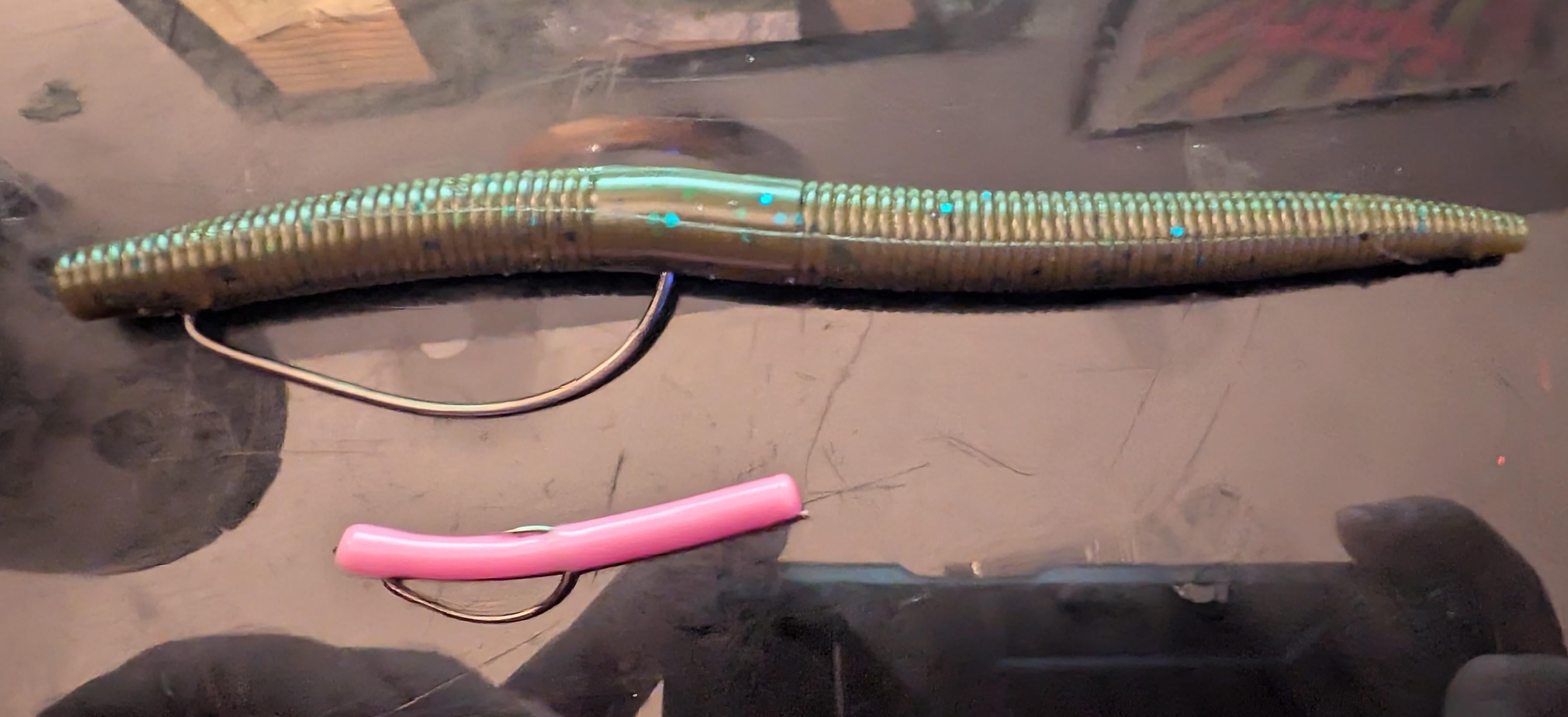 Took a Trout Magnet worm, cut it in half, melted the end slightly so it would round out. Rigged it on a size 6. Above is a 6" Yum Dinger on a 4/0 EWG for comparison.