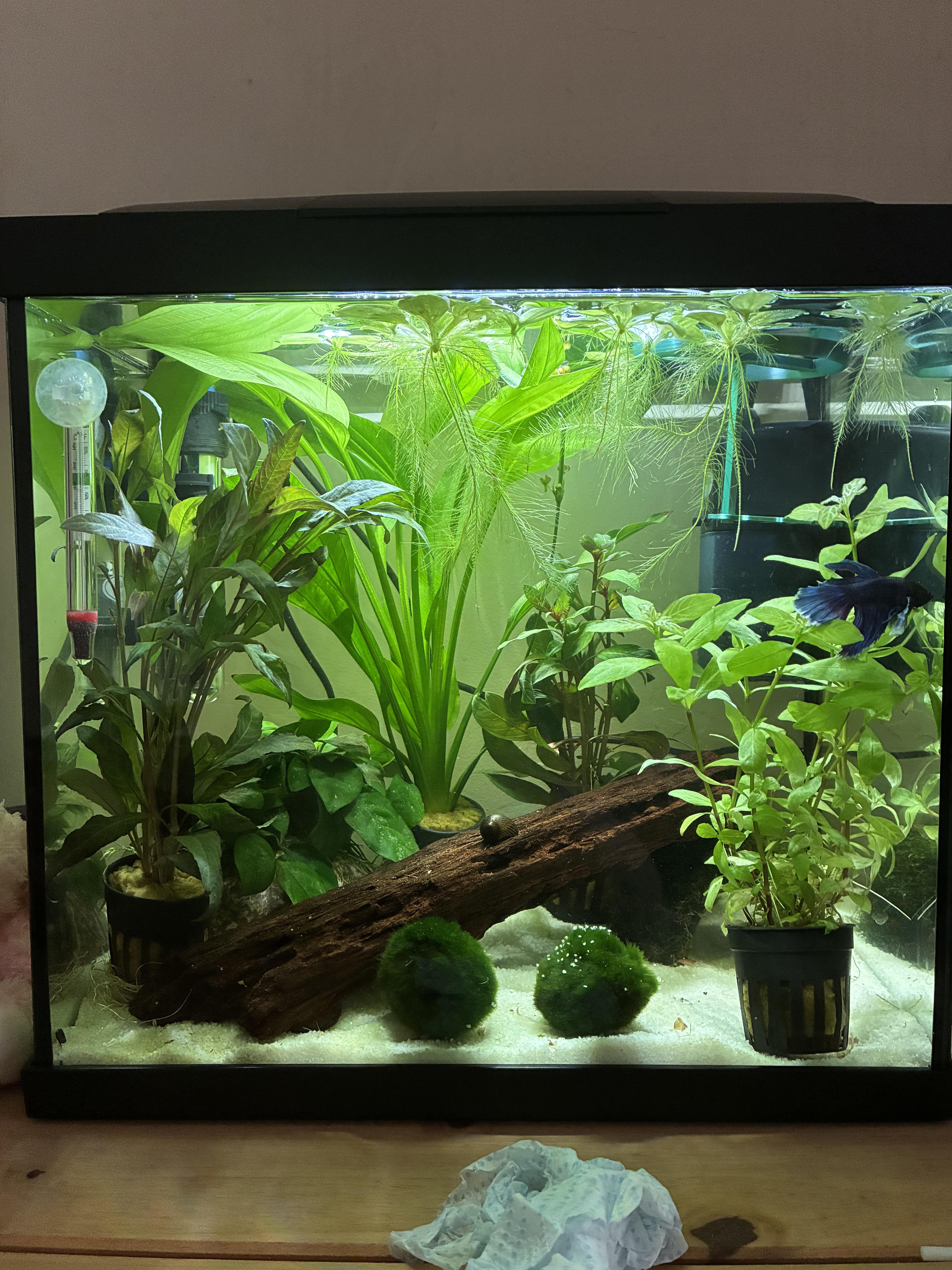 It's so cool to have a rainforest in my house 😁 I have Ribbon (my dumbo betta), I have Gary the nerite snail, and a small colony of cherry shrimp.